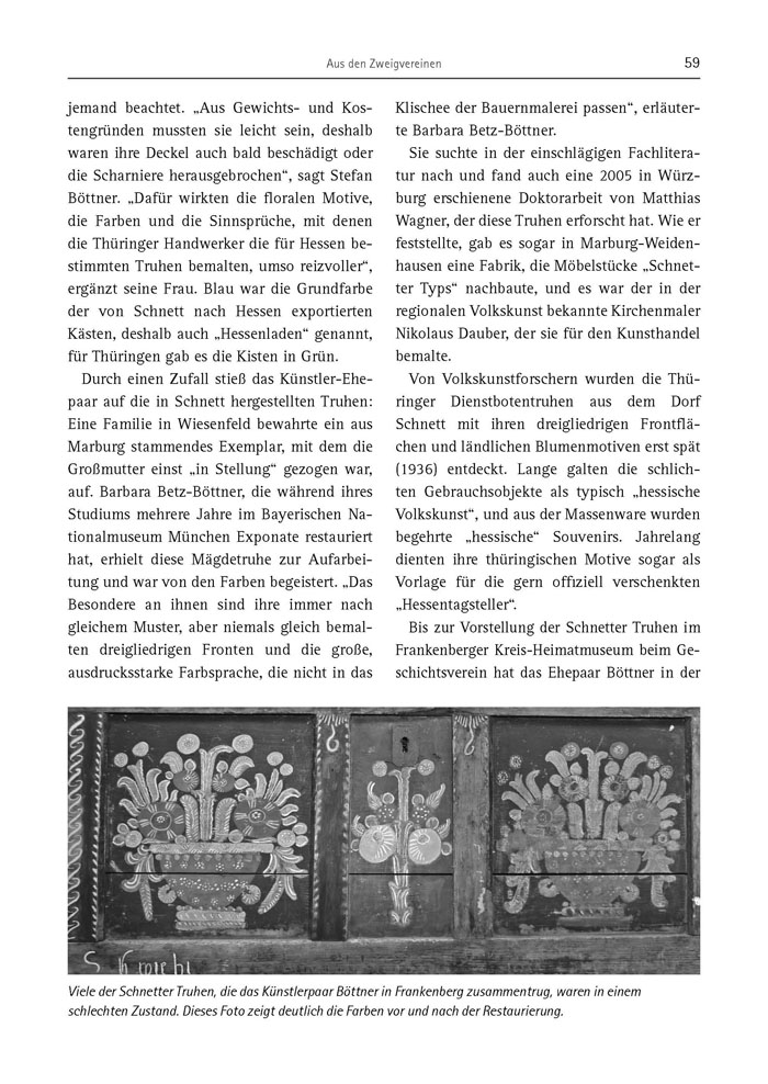 jemand beachtet. „Aus Gewichts- und Kostengründen mussten sie leicht sein, deshalb waren ihre Deckel auch bald beschädigt oder die Scharniere herausgebrochen“, sagt Stefan Böttner. „Dafür wirkten die floralen Motive, die Farben und die Sinnsprüche, mit denen die Thüringer Handwerker die für Hessen bestimmten Truhen bemalten, umso reizvoller“, ergänzt seine Frau. Blau war die Grundfarbe der von Schnett nach Hessen exportierten Kästen, deshalb auch „Hessenladen“ genannt, für Thüringen gab es die Kisten in Grün.