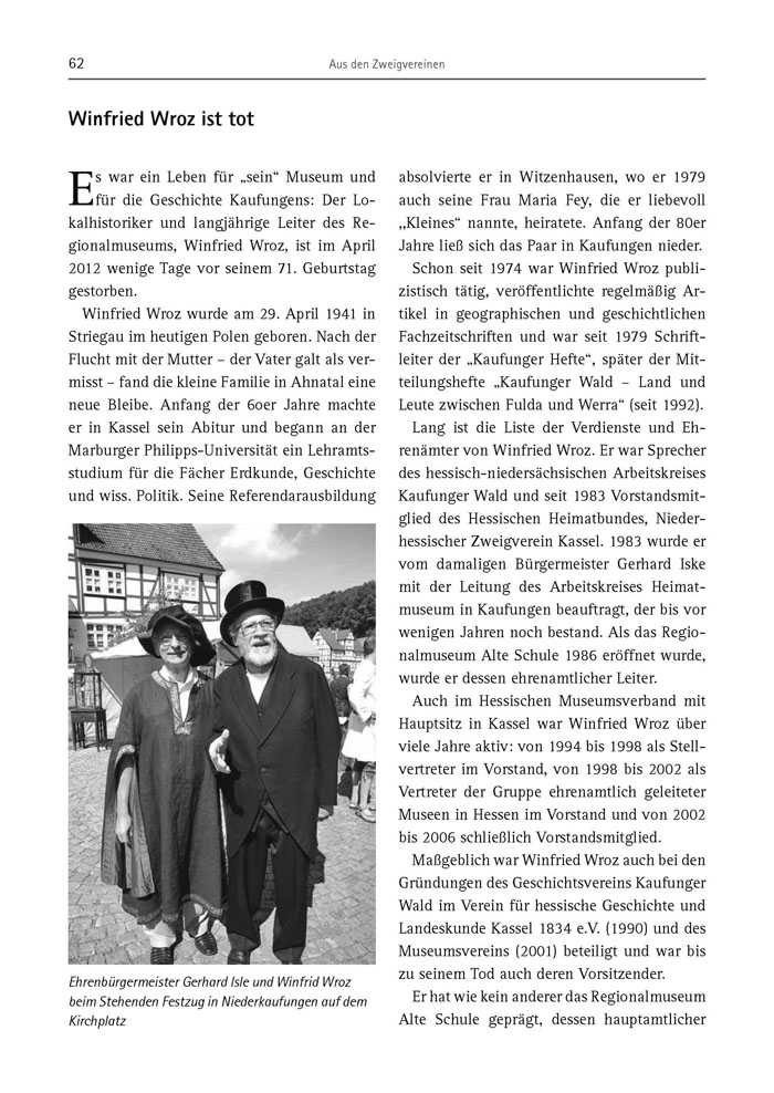 Es war ein Leben für „sein“ Museum und für die Geschichte Kaufungens: Der Lokalhistoriker und langjährige Leiter des Regionalmuseums, Winfried Wroz, ist im April 2012 wenige Tage vor seinem 71. Geburtstag gestorben.