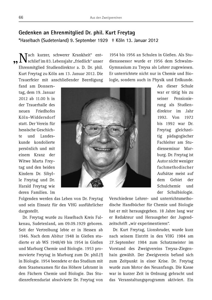 Nach kurzer, schwerer Krankheit“ entschlief im 83. Lebensjahr „friedlich“ unser Ehrenmitglied Studiendirektor a. D. Dr. phil. Kurt Freytag zu Köln am 13. Januar 2012. Die Trauerfeier mit anschließender Beerdigung fand am Donnerstag, dem 19. Januar 2012 ab 11.00 h in der Trauerhalle des neuen Friedhofes Köln-Widdersdorf statt. Der Verein für hessische Geschichte und Landeskunde kondolierte persönlich und mit einem Kranz der Witwe Marta Freytag und den beiden Kindern Dr. Sibylle Freytag und Dr. Harald Freytag wie deren Familien. Im Folgenden werden das Leben von Dr. Freytag und sein Einsatz für den VHG ausführlicher dargestellt.