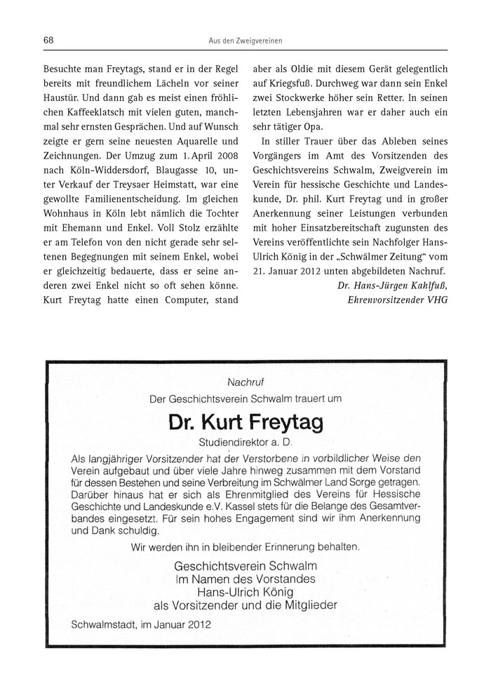 In stiller Trauer über das Ableben seines Vorgängers im Amt des Vorsitzenden des Geschichtsvereins Schwalm, Zweigverein im Verein für hessische Geschichte und Landeskunde, Dr. phil. Kurt Freytag und in großer Anerkennung seiner Leistungen verbunden mit hoher Einsatzbereitschaft zugunsten des Vereins veröffentlichte sein Nachfolger Hans-Ulrich König in der „Schwälmer Zeitung“ vom 21. Januar 2012 unten abgebildeten Nachruf.