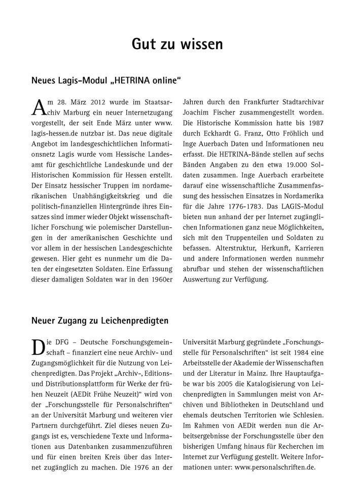 Am 28. März 2012 wurde im Staatsarchiv Marburg ein neuer Internetzugang vorgestellt, der seit Ende März unter www.lagis-hessen.de nutzbar ist. Das neue digitale Angebot im landesgeschichtlichen Informationsnetz Lagis wurde vom Hessische Landesamt für geschichtliche Landeskunde und der Historischen Kommission für Hessen erstellt. Der Einsatz hessischer Truppen im nordamerikanischen Unabhängigkeitskrieg und die politisch-finanziellen Hintergründe ihres Einsatzes sind immer wieder Objekt wissenschaftlicher Forschung wie polemischer Darstellungen in der amerikanischen Geschichte und vor allem in der hessischen Landesgeschichte gewesen. Hier geht es nunmehr um die Daten der eingesetzten Soldaten. Eine Erfassung dieser damaligen Soldaten war in den 1960er Jahren durch den Frankfurter Stadtarchivar Joachim Fischer zusammengestellt worden. Die Historische Kommission hatte bis 1987 durch Eckhardt G. Franz, Otto Fröhlich und Inge Auerbach Daten und Informationen neu erfasst. Die HETRINA-Bände stellen auf sechs Bänden Angaben zu den etwa 19.000 Soldaten zusammen. Inge Auerbach erarbeitete darauf eine wissenschaftliche Zusammenfassung des hessischen Einsatzes in Nordamerika für die Jahre 1776-1783. Das LAGIS-Modul bieten nun anhand der per Internet zugänglichen Informationen ganz neue Möglichkeiten, sich mit den Truppenteilen und Soldaten zu befassen. Alterstruktur, Herkunft, Karrieren und andere Informationen werden nunmehr abrufbar und stehen der wissenschaftlichen Auswertung zur Verfügung.