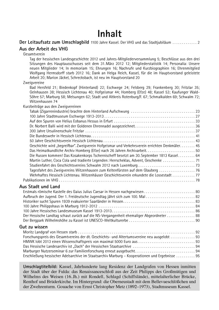 Tag der hessischen Landesgeschichte 2012 und Jahres-Mitgliederversammlung 5; Beschlüsse aus den drei Sitzungen des Hauptausschusses seit dem 31. März 2012 12; Mitgliederstatistik 14; Personalia: Unsere neuen Mitglieder 14; In memoriam 15; Ehrungen 16; Nachrufe und Kurzbiographien 16; Ehrenmitglied Wolfgang Hermsdorff starb 2012 16; Dank an Helga Reich, Kassel, für die im Hauptvorstand geleistete Arbeit 20; Marion Jäckel, Schrecksbach, ist neu im Hauptvorstand 20