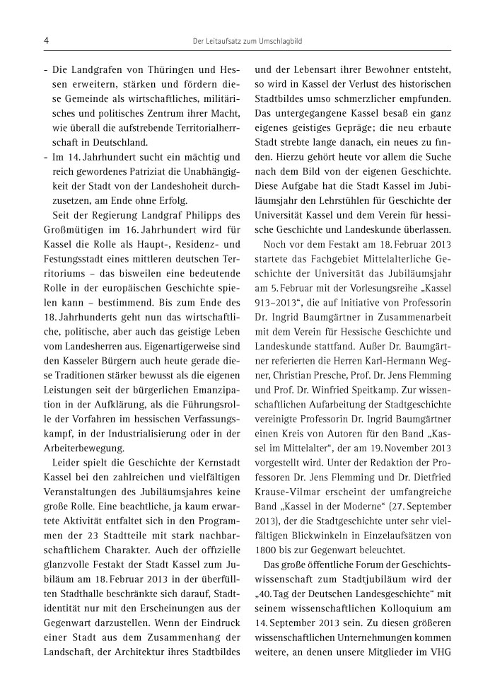 Leider spielt die Geschichte der Kernstadt Kassel bei den zahlreichen und vielfältigen Veranstaltungen des Jubiläumsjahres keine große Rolle. Eine beachtliche, ja kaum erwartete Aktivität entfaltet sich in den Programmen der 23 Stadtteile mit stark nachbarschaftlichem Charakter. Auch der offizielle glanzvolle Festakt der Stadt Kassel zum Jubiläum am 18. Februar 2013 in der überfüllten Stadthalle beschränkte sich darauf, Stadtidentität nur mit den Erscheinungen aus der Gegenwart darzustellen. Wenn der Eindruck einer Stadt aus dem Zusammenhang der Landschaft, der Architektur ihres Stadtbildes und der Lebensart ihrer Bewohner entsteht, so wird in Kassel der Verlust des historischen Stadtbildes umso schmerzlicher empfunden. Das untergegangene Kassel besaß ein ganz eigenes geistiges Gepräge; die neu erbaute Stadt strebte lange danach, ein neues zu finden. Hierzu gehört heute vor allem die Suche nach dem Bild von der eigenen Geschichte. Diese Aufgabe hat die Stadt Kassel im Jubiläumsjahr den Lehrstühlen für Geschichte der Universität Kassel und dem Verein für hessische Geschichte und Landeskunde überlassen.