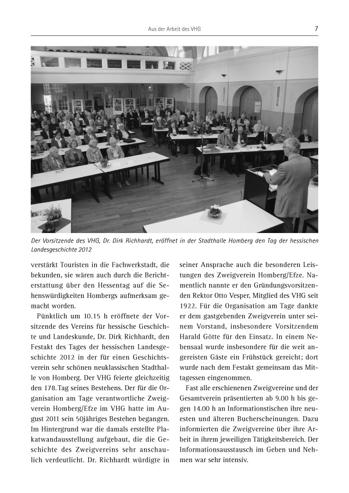Pünktlich um 10.15 h eröffnete der Vorsitzende des Vereins für hessische Geschichte und Landeskunde, Dr. Dirk Richhardt, den Festakt des Tages der hessischen Landesgeschichte 2012 in der für einen Geschichtsverein sehr schönen neuklassischen Stadthalle von Homberg. Der VHG feierte gleichzeitig den 178. Tag seines Bestehens. Der für die Organisation am Tage verantwortliche Zweigverein Homberg/Efze im VHG hatte im August 2011 sein 50jähriges Bestehen begangen. Im Hintergrund war die damals erstellte Plakatwandausstellung aufgebaut, die die Geschichte des Zweigvereins sehr anschaulich verdeutlicht. Dr. Richhardt würdigte in seiner Ansprache auch die besonderen Leistungen des Zweigverein Homberg/Efze. Namentlich nannte er den Gründungsvorsitzenden Rektor Otto Vesper, Mitglied des VHG seit 1922. Für die Organisation am Tage dankte er dem gastgebenden Zweigverein unter seinem Vorstand, insbesondere Vorsitzendem Harald Götte für den Einsatz. In einem Nebensaal wurde insbesondere für die weit angereisten Gäste ein Frühstück gereicht; dort wurde nach dem Festakt gemeinsam das Mittagessen eingenommen.