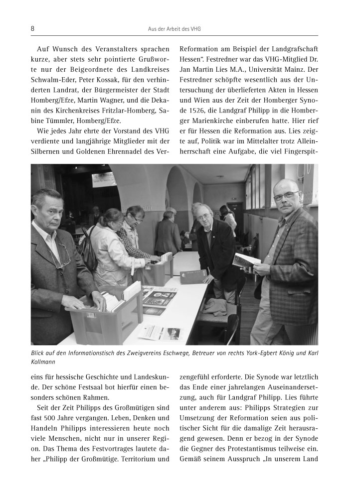 Seit der Zeit Philipps des Großmütigen sind fast 500 Jahre vergangen. Leben, Denken und Handeln Philipps interessieren heute noch viele Menschen, nicht nur in unserer Region. Das Thema des Festvortrages lautete daher „Philipp der Großmütige. Territorium und Reformation am Beispiel der Landgrafschaft Hessen“. Festredner war das VHG-Mitglied Dr. Jan Martin Lies M.A., Universität Mainz. Der Festredner schöpfte wesentlich aus der Untersuchung der überlieferten Akten in Hessen und Wien aus der Zeit der Homberger Synode 1526, die Landgraf Philipp in die Homberger Marienkirche einberufen hatte. Hier rief er für Hessen die Reformation aus. Lies zeigte auf, Politik war im Mittelalter trotz Alleinherrschaft eine Aufgabe, die viel Fingerspitzengefühl erforderte. Die Synode war letztlich das Ende einer jahrelangen Auseinandersetzung, auch für Landgraf Philipp. Lies führte unter anderem aus: Philipps Strategien zur Umsetzung der Reformation seien aus politischer Sicht für die damalige Zeit herausragend gewesen. Denn er bezog in der Synode die Gegner des Protestantismus teilweise ein. Gemäß seinem Ausspruch „In unserem Land