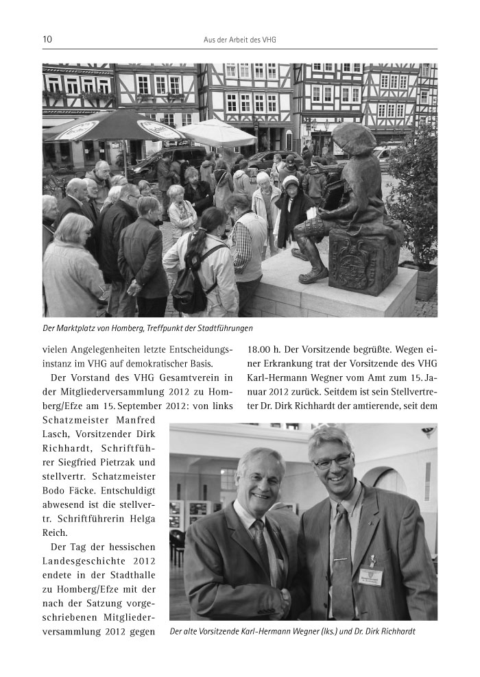Der Tag der hessischen Landesgeschichte 2012 endete in der Stadthalle zu Homberg/Efze mit der nach der Satzung vorgeschriebenen Mitgliederversammlung 2012 gegen 18.00 h. Der Vorsitzende begrüßte. Wegen einer Erkrankung trat der Vorsitzende des VHG Karl-Hermann Wegner vom Amt zum 15. Januar 2012 zurück. Seitdem ist sein Stellvertreter Dr. Dirk Richhardt der amtierende, seit dem