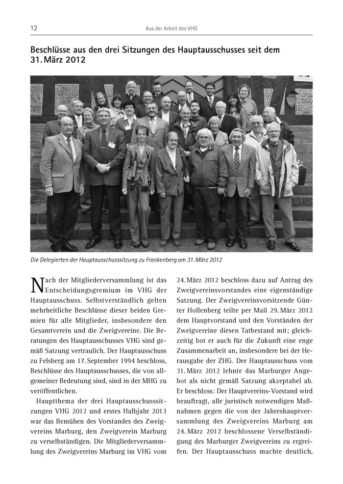 Hauptthema der drei Hauptausschusssitzungen VHG 2012 und erstes Halbjahr 2013 war das Bemühen des Vorstandes des Zweigvereins Marburg, den Zweigverein Marburg zu verselbständigen. Die Mitgliederversammlung des Zweigvereins Marburg im VHG vom 24. März 2012 beschloss dazu auf Antrag des Zweigvereinsvorstandes eine eigenständige Satzung. Der Zweigvereinsvorsitzende Günter Hollenberg teilte per Mail 29. März 2012 dem Hauptvorstand und den Vorständen der Zweigvereine diesen Tatbestand mit; gleichzeitig bot er auch für die Zukunft eine enge Zusammenarbeit an, insbesondere bei der Herausgabe der ZHG. Der Hauptausschuss vom 31. März 2012 lehnte das Marburger Angebot als nicht gemäß Satzung akzeptabel ab. Er beschloss: Der Hauptvereins-Vorstand wird beauftragt, alle juristisch notwendigen Maßnahmen gegen die von der Jahreshauptversammlung des Zweigvereins Marburg am 24. März 2012 beschlossene Verselbständigung des Marburger Zweigvereins zu ergreifen. Der Hauptausschuss machte deutlich,