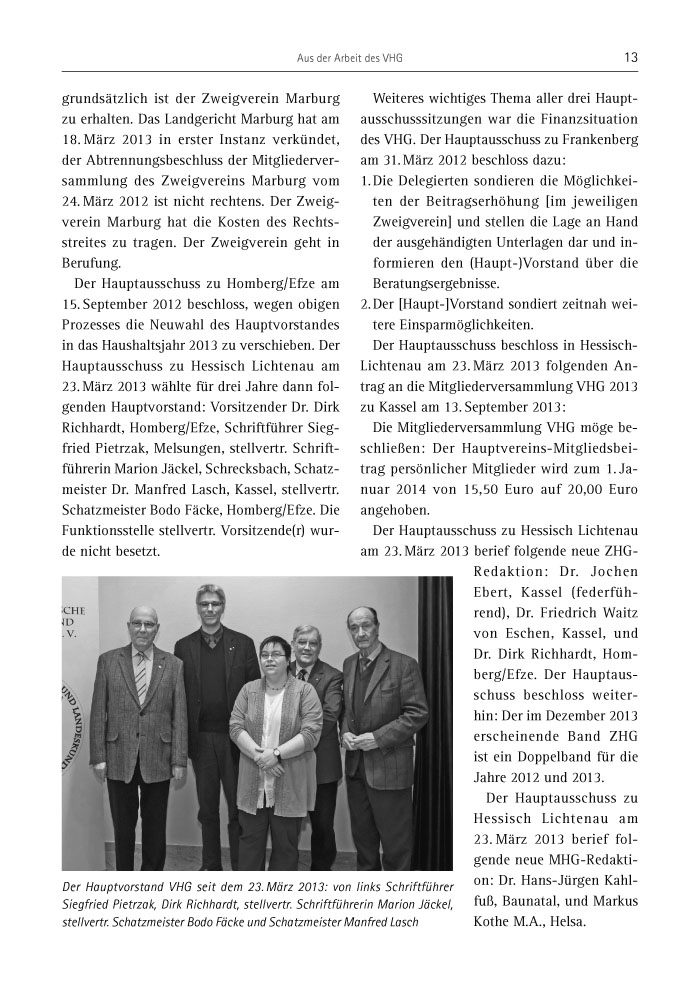 Der Hauptausschuss zu Hessisch Lichtenau am 23. März 2013 berief folgende neue ZHG-Redaktion: Dr. Jochen Ebert, Kassel (federführend), Dr. Friedrich Waitz von Eschen, Kassel, und Dr. Dirk Richhardt, Homberg/Efze. Der Hauptausschuss beschloss weiterhin: Der im Dezember 2013 erscheinende Band ZHG ist ein Doppelband für die Jahre 2012 und 2013.