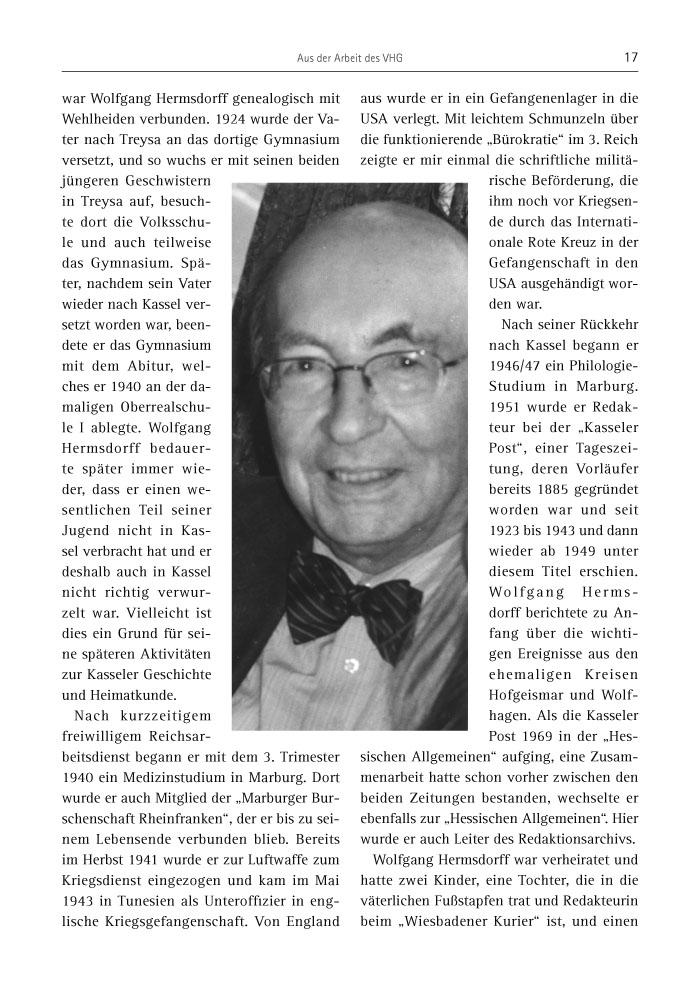 war Wolfgang Hermsdorff genealogisch mit Wehlheiden verbunden. 1924 wurde der Vater nach Treysa an das dortige Gymnasium versetzt, und so wuchs er mit seinen beiden jüngeren Geschwistern in Treysa auf, besuchte dort die Volksschule und auch teilweise das Gymnasium. Später, nachdem sein Vater wieder nach Kassel versetzt worden war, beendete er das Gymnasium mit dem Abitur, welches er 1940 an der damaligen Oberrealschule I ablegte. Wolfgang Hermsdorff bedauerte später immer wieder, dass er einen wesentlichen Teil seiner Jugend nicht in Kassel verbracht hat und er deshalb auch in Kassel nicht richtig verwurzelt war. Vielleicht ist dies ein Grund für seine späteren Aktivitäten zur Kasseler Geschichte und Heimatkunde.