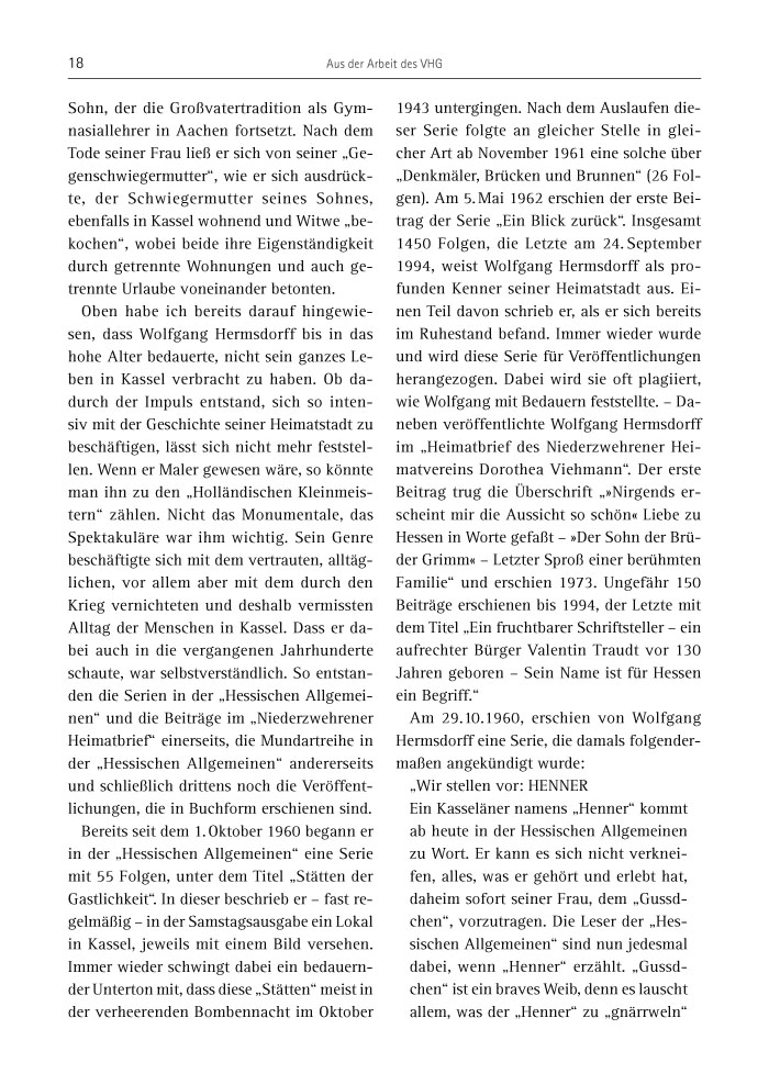 Oben habe ich bereits darauf hingewiesen, dass Wolfgang Hermsdorff bis in das hohe Alter bedauerte, nicht sein ganzes Leben in Kassel verbracht zu haben. Ob dadurch der Impuls entstand, sich so intensiv mit der Geschichte seiner Heimatstadt zu beschäftigen, lässt sich nicht mehr feststellen. Wenn er Maler gewesen wäre, so könnte man ihn zu den „Holländischen Kleinmeistern“ zählen. Nicht das Monumentale, das Spektakuläre war ihm wichtig. Sein Genre beschäftigte sich mit dem vertrauten, alltäglichen, vor allem aber mit dem durch den Krieg vernichteten und deshalb vermissten Alltag der Menschen in Kassel. Dass er dabei auch in die vergangenen Jahrhunderte schaute, war selbstverständlich. So entstanden die Serien in der „Hessischen Allgemeinen“ und die Beiträge im „Niederzwehrener Heimatbrief“ einerseits, die Mundartreihe in der „Hessischen Allgemeinen“ andererseits und schließlich drittens noch die Veröffentlichungen, die in Buchform erschienen sind.