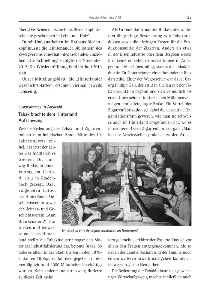 Welche Bedeutung der Tabak- und Zigarrenindustrie im heimischen Raum Mitte des 19. Jahrhunderts zufiel, hat jetzt der Leiter des Stadtarchivs Gießen, Dr. Ludwig Brake, in einem Vortrag am 19. April 2013 in Gladenbach gezeigt. Dazu eingeladen hatten der Hinterländer Geschichtsverein sowie der Heimat- und Geschichtsverein „Amt Blankenstein“. Für Gießen und teilweise auch das Hinterland stellte die Tabakindustrie sogar den Motor der Industrialisierung dar, betonte Brake. So habe es allein in der Stadt Gießen in den 1870-er Jahren 18 Zigarrenfabriken gegeben, in denen täglich rund 3000 Mitarbeiter beschäftigt wurden. Kein anderer Industriezweig florierte zu dieser Zeit mehr.