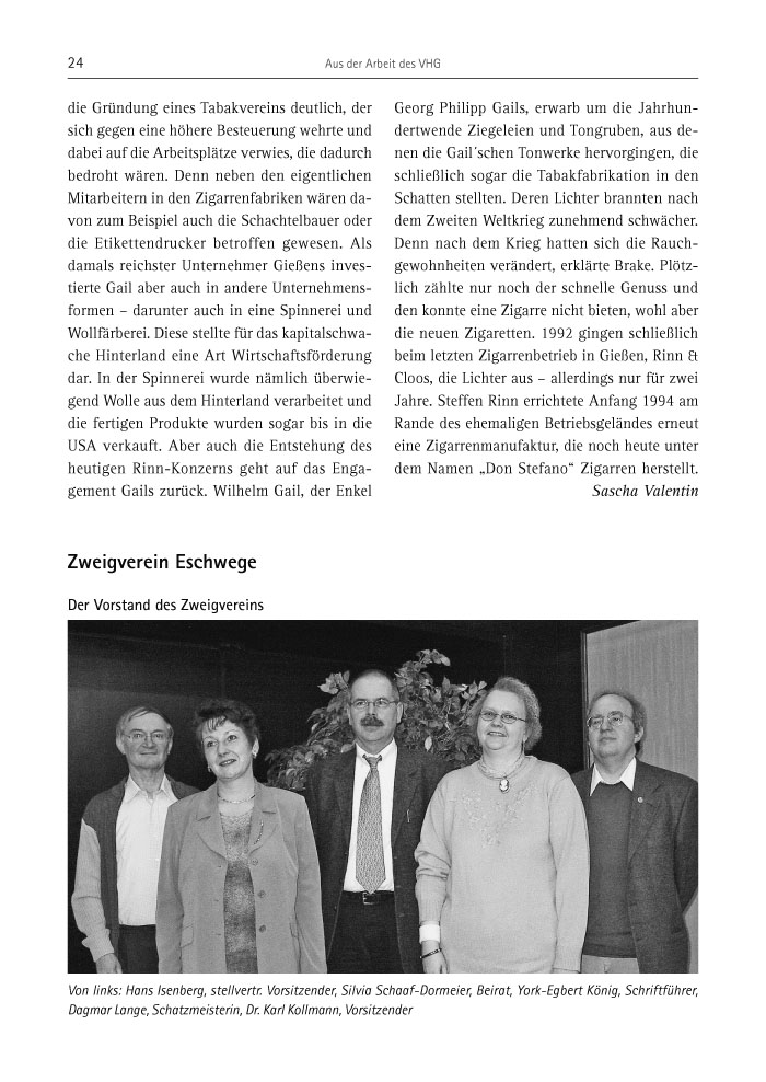 die Gründung eines Tabakvereins deutlich, der sich gegen eine höhere Besteuerung wehrte und dabei auf die Arbeitsplätze verwies, die dadurch bedroht wären. Denn neben den eigentlichen Mitarbeitern in den Zigarrenfabriken wären davon zum Beispiel auch die Schachtelbauer oder die Etikettendrucker betroffen gewesen. Als damals reichster Unternehmer Gießens investierte Gail aber auch in andere Unternehmensformen – darunter auch in eine Spinnerei und Wollfärberei. Diese stellte für das kapitalschwache Hinterland eine Art Wirtschaftsförderung dar. In der Spinnerei wurde nämlich überwiegend Wolle aus dem Hinterland verarbeitet und die fertigen Produkte wurden sogar bis in die USA verkauft. Aber auch die Entstehung des heutigen Rinn-Konzerns geht auf das Engagement Gails zurück. Wilhelm Gail, der Enkel Georg Philipp Gails, erwarb um die Jahrhundertwende Ziegeleien und Tongruben, aus denen die Gail´schen Tonwerke hervorgingen, die schließlich sogar die Tabakfabrikation in den Schatten stellten. Deren Lichter brannten nach dem Zweiten Weltkrieg zunehmend schwächer. Denn nach dem Krieg hatten sich die Rauchgewohnheiten verändert, erklärte Brake. Plötzlich zählte nur noch der schnelle Genuss und den konnte eine Zigarre nicht bieten, wohl aber die neuen Zigaretten. 1992 gingen schließlich beim letzten Zigarrenbetrieb in Gießen, Rinn & Cloos, die Lichter aus – allerdings nur für zwei Jahre. Steffen Rinn errichtete Anfang 1994 am Rande des ehemaligen Betriebsgeländes erneut eine Zigarrenmanufaktur, die noch heute unter dem Namen „Don Stefano“ Zigarren herstellt.Sascha Valentin