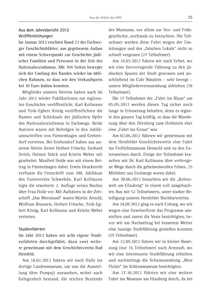 Mitglieder unseres Vereins haben auch im Jahr 2012 wieder Publikationen zur regionalen Geschichte veröffentlicht. Karl Kollmann und York-Egbert König veröffentlichten die Namen und Schicksale der jüdischen Opfer des Nationalsozialismus in Eschwege. Beide Autoren waren mit Beiträgen in den Jubiläumsschriften von Fürstenhagen und Grebendorf vertreten. Bei Grebendorf haben aus unserem Verein ferner Herbert Fritsche, Gerhard Strieb, Helmut Stück und Kristin Weber mit gearbeitet. Manfred Heide war mit einem Beitrag in Fürstenhagen dabei. Erwin Heuckeroth verfasste die Festschrift zum 100. Jubiläum des Turnvereins Schwebda. Karl Kollmann legte die erweiterte 2. Auflage seines Buches über Frau Holle vor. Mit Aufsätzen in der Zeitschrift „Das Werraland“ waren Martin Arnold, Wolfram Brauneis, Herbert Fritsche, York-Egbert König, Karl Kollmann und Kristin Weber vertreten.