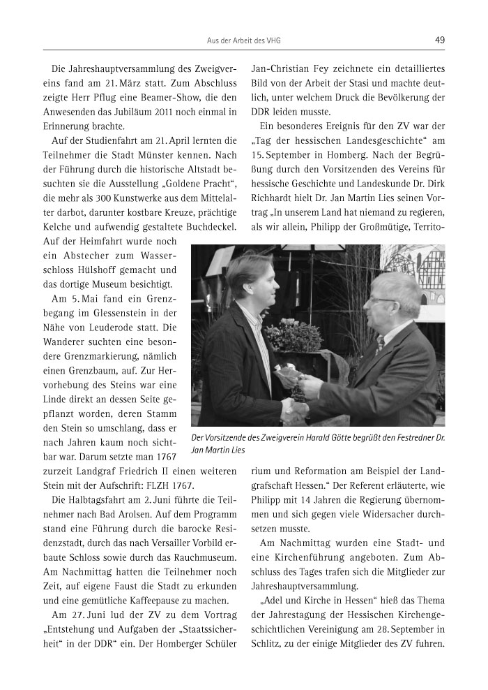 Ein besonderes Ereignis für den ZV war der „Tag der hessischen Landesgeschichte“ am 15. September in Homberg. Nach der Begrüßung durch den Vorsitzenden des Vereins für hessische Geschichte und Landeskunde Dr. Dirk Richhardt hielt Dr. Jan Martin Lies seinen Vortrag „In unserem Land hat niemand zu regieren, als wir allein, Philipp der Großmütige, Territorium und Reformation am Beispiel der Landgrafschaft Hessen.“ Der Referent erläuterte, wie Philipp mit 14 Jahren die Regierung übernommen und sich gegen viele Widersacher durchsetzen musste.