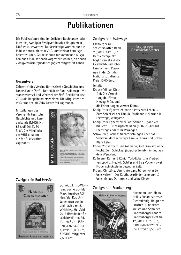 Zeitschrift des Vereins für hessische Geschichte und Landeskunde (ZHG): Der nächste Band soll wegen Vorstandswechsel und Wechsel der ZHG-Redaktion erst 2013 als Doppelband erscheinen. Die Mitglieder des VHG erhalten die ZHG kostenfrei zugesandt.