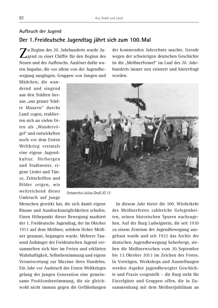 In diesem Jahr bietet die 100. Wiederkehr des Meißnerfestes zahlreiche Gelegenheiten, seinen historischen Spuren nachzugehen. Auf der Burg Ludwigstein, die seit 1920 zu einem Zentrum der Jugendbewegung ausgebaut wurde und seit 1922 das Archiv der deutschen Jugendbewegung beherbergt, stehen die Meißnerwochen vom 30. September bis 13. Oktober 2013 im Zeichen des Festes. In Vorträgen, Workshops und Ausstellungen werden Aspekte jugendbewegter Geschichte und Praxis vorgestellt – die Burg steht für Einzelgäste und Gruppen offen, die in Zusammenhang mit dem Meißnerjubiläum an