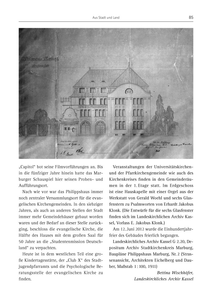 Landeskirchliches Archiv Kassel G 2.20, Depositum Archiv Stadtkirchenkreis Marburg, Baupläne Philippshaus Marburg, Nr. 2 (Strassenansicht, Architekten Eichelberg und Dauber, Maßstab 1 : 100, 1911)