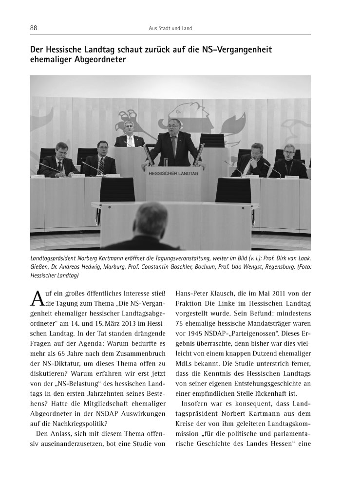 Auf ein großes öffentliches Interesse stieß die Tagung zum Thema „Die NS-Vergangenheit ehemaliger hessischer Landtagsabgeordneter“ am 14. und 15. März 2013 im Hessischen Landtag. In der Tat standen drängende Fragen auf der Agenda: Warum bedurfte es mehr als 65 Jahre nach dem Zusammenbruch der NS-Diktatur, um dieses Thema offen zu diskutieren? Warum erfahren wir erst jetzt von der „NS-Belastung“ des hessischen Landtags in den ersten Jahrzehnten seines Bestehens? Hatte die Mitgliedschaft ehemaliger Abgeordneter in der NSDAP Auswirkungen auf die Nachkriegspolitik?