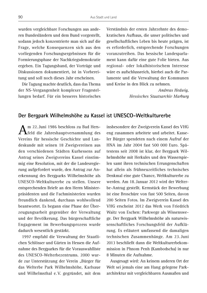 Am 22. Juni 1986 beschloss zu Bad Hersfeld die Jahreshauptversammlung des Vereins für hessische Geschichte und Landeskunde mit seinen 18 Zweigvereinen aus den verschiedenen Städten Kurhessens auf Antrag seines Zweigvereins Kassel einstimmig eine Resolution, mit der die Landesregierung aufgefordert wurde, den Antrag zur Anerkennung des Bergparks Wilhelmshöhe als UNESCO-Weltkulturerbe zu stellen. Unsere entsprechenden Briefe an den Herrn Ministerpräsidenten und die Fachministerien wurden freundlich dankend, durchaus wohlwollend beantwortet. Es begann eine Phase der Überzeugungsarbeit gegenüber der Verwaltung und der Bevölkerung. Das bürgerschaftliche Engagement im Bewerbungsprozess wurde dadurch wesentlich gestärkt.