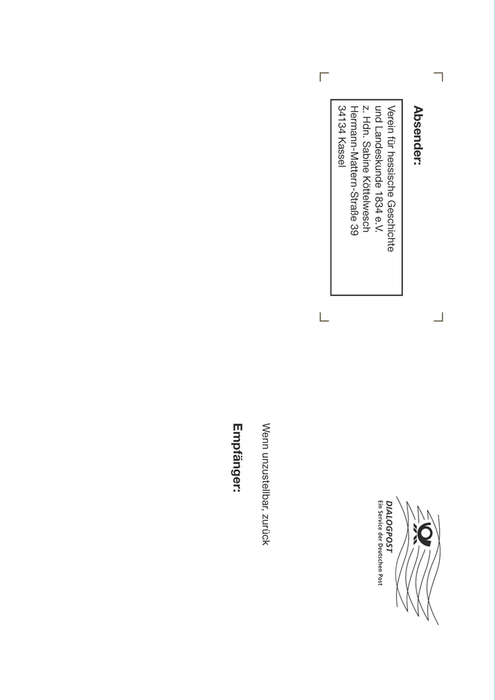 Absender: Verein für hessische Geschichte und Landeskunde 1834 e.V. z. Hdn. Sabine Köttelwesch Hermann-Mattern-Straße 39 34134 Kassel