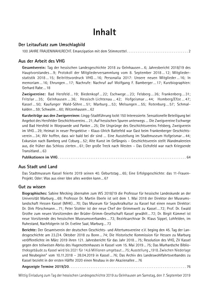 Gesamtverein: Tag der hessischen Landesgeschichte 2018 zu Gelnhausen … 6; Jahresbericht 2018/19 des