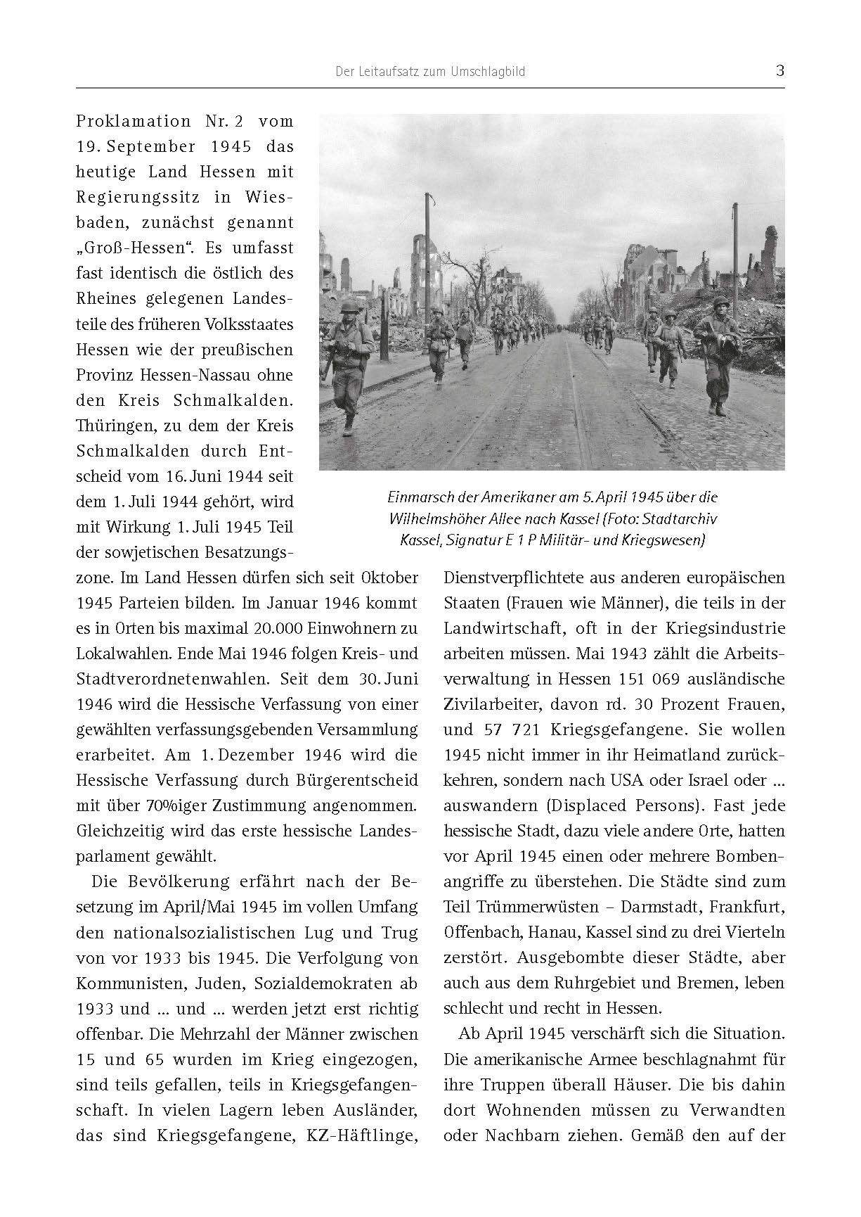 Der Leitaufsatz zum Umschlagbild 3 Proklamation Nr. 2 vom 19. September 1945 das heutige Land Hessen mit Regierungssitz in Wiesbaden, zunächst genannt „Groß-Hessen“. Es umfasst fast identisch die östlich des Rheines gelegenen Landesteile des früheren Volksstaates Hessen wie der preußischen Provinz Hessen-Nassau ohne den Kreis Schmalkalden. Thüringen, zu dem der Kreis Schmalkalden durch Entscheid vom 16. Juni 1944 seit dem 1. Juli 1944 gehört, wird mit Wirkung 1. Juli 1945 Teil der sowjetischen Besatzungszone. Im Land Hessen dürfen sich seit Oktober 1945 Parteien bilden. Im Januar 1946 kommt es in Orten bis maximal 20.000 Einwohnern zu Lokalwahlen. Ende Mai 1946 folgen Kreis- und Stadtverordnetenwahlen. Seit dem 30. Juni 1946 wird die Hessische Verfassung von einer gewählten verfassungsgebenden Versammlung erarbeitet. Am 1. Dezember 1946 wird die Hessische Verfassung durch Bürgerentscheid mit über 70%iger Zustimmung angenommen. Gleichzeitig wird das erste hessische Landesparlament gewählt. Die Bevölkerung erfährt nach der Besetzung im April/Mai 1945 im vollen Umfang den nationalsozialistischen Lug und Trug von vor 1933 bis 1945. Die Verfolgung von Kommunisten, Juden, Sozialdemokraten ab 1933 und … und … werden jetzt erst richtig offenbar. Die Mehrzahl der Männer zwischen 15 und 65 wurden im Krieg eingezogen, sind teils gefallen, teils in Kriegsgefangenschaft. In vielen Lagern leben Ausländer, das sind Kriegsgefangene, KZ-Häftlinge, Dienstverpflichtete aus anderen europäischen Staaten (Frauen wie Männer), die teils in der Landwirtschaft, oft in der Kriegsindustrie arbeiten müssen. Mai 1943 zählt die Arbeitsverwaltung in Hessen 151 069 ausländische Zivilarbeiter, davon rd. 30 Prozent Frauen, und 57 721 Kriegsgefangene. Sie wollen 1945 nicht immer in ihr Heimatland zurückkehren, sondern nach USA oder Israel oder … auswandern (Displaced Persons). Fast jede hessische Stadt, dazu viele andere Orte, hatten vor April 1945 einen oder mehrere Bombenangriffe zu überstehen. Die Städte sind zum Teil Trümmerwüsten – Darmstadt, Frankfurt, Offenbach, Hanau, Kassel sind zu drei Vierteln zerstört. Ausgebombte dieser Städte, aber auch aus dem Ruhrgebiet und Bremen, leben schlecht und recht in Hessen. Ab April 1945 verschärft sich die Situation. Die amerikanische Armee beschlagnahmt für ihre Truppen überall Häuser. Die bis dahin dort Wohnenden müssen zu Verwandten oder Nachbarn ziehen. Gemäß den auf der Einmarsch der Amerikaner am 5. April 1945 über die Wilhelmshöher Allee nach Kassel (Foto: Stadtarchiv Kassel, Signatur E 1 P Militär- und Kriegswesen)
