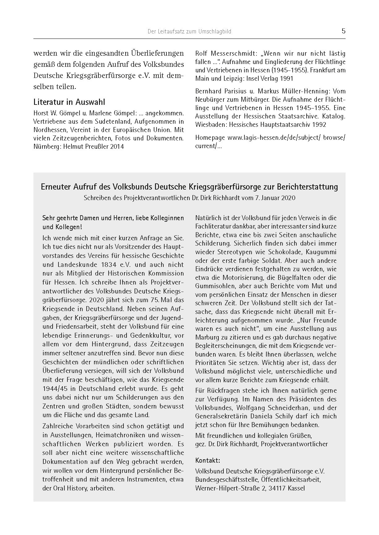 Der Leitaufsatz zum Umschlagbild 5 werden wir die eingesandten Überlieferungen gemäß dem folgenden Aufruf des Volksbundes Deutsche Kriegsgräberfürsorge e.V. mit demselben teilen. Literatur in Auswahl Horst W. Gömpel u. Marlene Gömpel: … angekommen. Vertriebene aus dem Sudetenland, Aufgenommen in Nordhessen, Vereint in der Europäischen Union. Mit vielen Zeitzeugenberichten, Fotos und Dokumenten. Nürnberg: Helmut Preußler 2014 Rolf Messerschmidt: „Wenn wir nur nicht lästig fallen …“. Aufnahme und Eingliederung der Flüchtlinge und Vertriebenen in Hessen (1945–1955). Frankfurt am Main und Leipzig: Insel Verlag 1991 Bernhard Parisius u. Markus Müller-Henning: Vom Neubürger zum Mitbürger. Die Aufnahme der Flüchtlinge und Vertriebenen in Hessen 1945–1955. Eine Ausstellung der Hessischen Staatsarchive. Katalog. Wiesbaden: Hessisches Hauptstaatsarchiv 1992 Homepage www.lagis-hessen.de/de/subject/ browse/ current/… Sehr geehrte Damen und Herren, liebe Kolleginnen und Kollegen! Ich wende mich mit einer kurzen Anfrage an Sie. Ich tue dies nicht nur als Vorsitzender des Hauptvorstandes des Vereins für hessische Geschichte und Landeskunde 1834 e.V. und auch nicht nur als Mitglied der Historischen Kommission für Hessen. Ich schreibe Ihnen als Projektverantwortlicher des Volksbundes Deutsche Kriegsgräberfürsorge. 2020 jährt sich zum 75. Mal das Kriegsende in Deutschland. Neben seinen Aufgaben, der Kriegsgräberfürsorge und der Jugendund Friedensarbeit, steht der Volksbund für eine lebendige Erinnerungs- und Gedenkkultur, vor allem vor dem Hintergrund, dass Zeitzeugen immer seltener anzutreffen sind. Bevor nun diese Geschichten der mündlichen oder schriftlichen Überlieferung versiegen, will sich der Volksbund mit der Frage beschäftigen, wie das Kriegsende 1944/45 in Deutschland erlebt wurde. Es geht uns dabei nicht nur um Schilderungen aus den Zentren und großen Städten, sondern bewusst um die Fläche und das gesamte Land. Zahlreiche Vorarbeiten sind schon getätigt und in Ausstellungen, Heimatchroniken und wissenschaftlichen Werken publiziert worden. Es soll aber nicht eine weitere wissenschaftliche Dokumentation auf den Weg gebracht werden, wir wollen vor dem Hintergrund persönlicher Betroffenheit und mit anderen Instrumenten, etwa der Oral History, arbeiten. Natürlich ist der Volksbund für jeden Verweis in die Fachliteratur dankbar, aber interessanter sind kurze Berichte, etwa eine bis zwei Seiten anschauliche Schilderung. Sicherlich finden sich dabei immer wieder Stereotypen wie Schokolade, Kaugummi oder der erste farbige Soldat. Aber auch andere Eindrücke verdienen festgehalten zu werden, wie etwa die Motorisierung, die Bügelfalten oder die Gummisohlen, aber auch Berichte vom Mut und vom persönlichen Einsatz der Menschen in dieser schweren Zeit. Der Volksbund stellt sich der Tatsache, dass das Kriegsende nicht überall mit Erleichterung aufgenommen wurde. „Nur Freunde waren es auch nicht“, um eine Ausstellung aus Marburg zu zitieren und es gab durchaus negative Begleiterscheinungen, die mit dem Kriegsende verbunden waren. Es bleibt Ihnen überlassen, welche Prioritäten Sie setzen. Wichtig aber ist, dass der Volksbund möglichst viele, unterschiedliche und vor allem kurze Berichte zum Kriegsende erhält. Für Rückfragen stehe ich Ihnen natürlich gerne zur Verfügung. Im Namen des Präsidenten des Volksbundes, Wolfgang Schneiderhan, und der Generalsekretärin Daniela Schily darf ich mich jetzt schon für Ihre Bemühungen bedanken. Mit freundlichen und kollegialen Grüßen, gez. Dr. Dirk Richhardt, Projektverantwortlicher Kontakt: Volksbund Deutsche Kriegsgräberfürsorge e.V. Bundesgeschäftsstelle, Öffentlichkeitsarbeit, Werner-Hilpert-Straße 2, 34117 Kassel Erneuter Aufruf des Volksbunds Deutsche Kriegsgräberfürsorge zur Berichterstattung Schreiben des Projektverantwortlichen Dr. Dirk Richhardt vom 7. Januar 2020