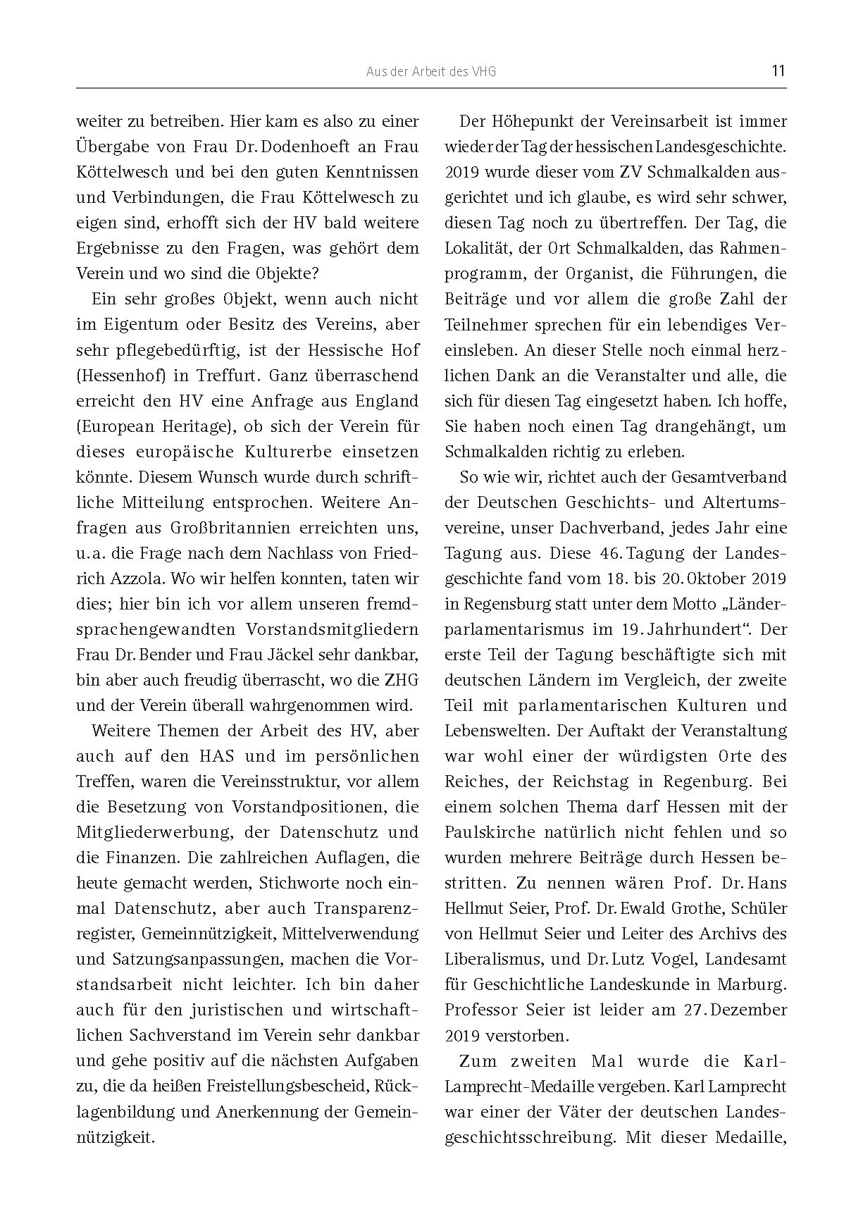 Aus der Arbeit des VHG 11 weiter zu betreiben. Hier kam es also zu einer Übergabe von Frau Dr. Dodenhoeft an Frau Köttelwesch und bei den guten Kenntnissen und Verbindungen, die Frau Köttelwesch zu eigen sind, erhofft sich der HV bald weitere Ergebnisse zu den Fragen, was gehört dem Verein und wo sind die Objekte? Ein sehr großes Objekt, wenn auch nicht im Eigentum oder Besitz des Vereins, aber sehr pflegebedürftig, ist der Hessische Hof (Hessenhof) in Treffurt. Ganz überraschend erreicht den HV eine Anfrage aus England (European Heritage), ob sich der Verein für dieses europäische Kulturerbe einsetzen könnte. Diesem Wunsch wurde durch schriftliche Mitteilung entsprochen. Weitere Anfragen aus Großbritannien erreichten uns, u. a. die Frage nach dem Nachlass von Friedrich Azzola. Wo wir helfen konnten, taten wir dies; hier bin ich vor allem unseren fremdsprachengewandten Vorstandsmitgliedern Frau Dr. Bender und Frau Jäckel sehr dankbar, bin aber auch freudig überrascht, wo die ZHG und der Verein überall wahrgenommen wird. Weitere Themen der Arbeit des HV, aber auch auf den HAS und im persönlichen Treffen, waren die Vereinsstruktur, vor allem die Besetzung von Vorstandpositionen, die Mitgliederwerbung, der Datenschutz und die Finanzen. Die zahlreichen Auflagen, die heute gemacht werden, Stichworte noch einmal Datenschutz, aber auch Transparenzregister, Gemeinnützigkeit, Mittelverwendung und Satzungsanpassungen, machen die Vorstandsarbeit nicht leichter. Ich bin daher auch für den juristischen und wirtschaftlichen Sachverstand im Verein sehr dankbar und gehe positiv auf die nächsten Aufgaben zu, die da heißen Freistellungsbescheid, Rücklagenbildung und Anerkennung der Gemeinnützigkeit. Der Höhepunkt der Vereinsarbeit ist immer wieder der Tag der hessischen Landesgeschichte. 2019 wurde dieser vom ZV Schmalkalden ausgerichtet und ich glaube, es wird sehr schwer, diesen Tag noch zu übertreffen. Der Tag, die Lokalität, der Ort Schmalkalden, das Rahmenprogramm, der Organist, die Führungen, die Beiträge und vor allem die große Zahl der Teilnehmer sprechen für ein lebendiges Vereinsleben. An dieser Stelle noch einmal herzlichen Dank an die Veranstalter und alle, die sich für diesen Tag eingesetzt haben. Ich hoffe, Sie haben noch einen Tag drangehängt, um Schmalkalden richtig zu erleben. So wie wir, richtet auch der Gesamtverband der Deutschen Geschichts- und Altertumsvereine, unser Dachverband, jedes Jahr eine Tagung aus. Diese 46. Tagung der Landesgeschichte fand vom 18. bis 20. Oktober 2019 in Regensburg statt unter dem Motto „Länderparlamentarismus im 19. Jahrhundert“. Der erste Teil der Tagung beschäftigte sich mit deutschen Ländern im Vergleich, der zweite Teil mit parlamentarischen Kulturen und Lebenswelten. Der Auftakt der Veranstaltung war wohl einer der würdigsten Orte des Reiches, der Reichstag in Regenburg. Bei einem solchen Thema darf Hessen mit der Paulskirche natürlich nicht fehlen und so wurden mehrere Beiträge durch Hessen bestritten. Zu nennen wären Prof. Dr. Hans Hellmut Seier, Prof. Dr. Ewald Grothe, Schüler von Hellmut Seier und Leiter des Archivs des Liberalismus, und Dr. Lutz Vogel, Landesamt für Geschichtliche Landeskunde in Marburg. Professor Seier ist leider am 27. Dezember 2019 verstorben. Zum zweiten Mal wurde die Karl- Lamprecht-Medaille vergeben. Karl Lamprecht war einer der Väter der deutschen Landesgeschichtsschreibung. Mit dieser Medaille,