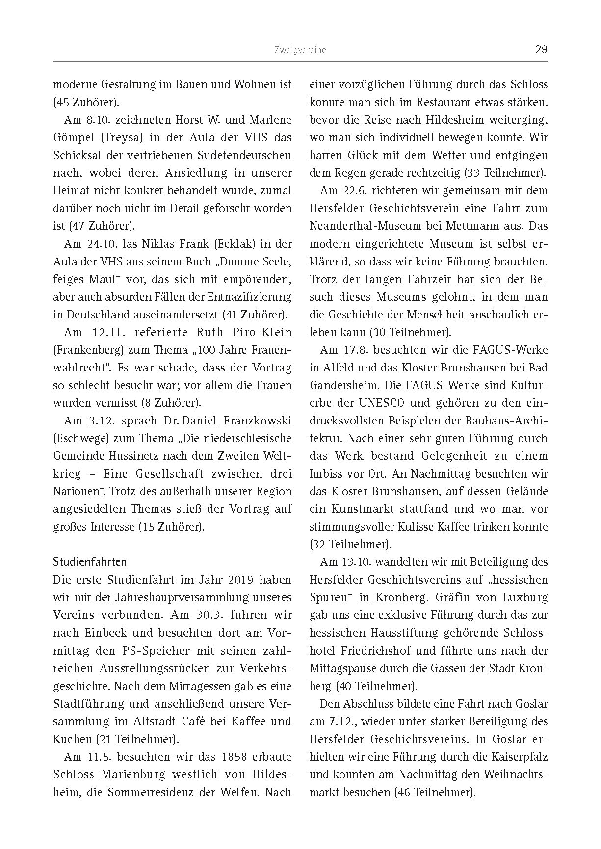 Zweigvereine 29 moderne Gestaltung im Bauen und Wohnen ist (45 Zuhörer). Am 8.10. zeichneten Horst W. und Marlene Gömpel (Treysa) in der Aula der VHS das Schicksal der vertriebenen Sudetendeutschen nach, wobei deren Ansiedlung in unserer Heimat nicht konkret behandelt wurde, zumal darüber noch nicht im Detail geforscht worden ist (47 Zuhörer). Am 24.10. las Niklas Frank (Ecklak) in der Aula der VHS aus seinem Buch „Dumme Seele, feiges Maul“ vor, das sich mit empörenden, aber auch absurden Fällen der Entnazifizierung in Deutschland auseinandersetzt (41 Zuhörer). Am 12.11. referierte Ruth Piro-Klein (Frankenberg) zum Thema „100 Jahre Frauenwahlrecht“. Es war schade, dass der Vortrag so schlecht besucht war; vor allem die Frauen wurden vermisst (8 Zuhörer). Am 3.12. sprach Dr. Daniel Franzkowski (Eschwege) zum Thema „Die niederschlesische Gemeinde Hussinetz nach dem Zweiten Weltkrieg – Eine Gesellschaft zwischen drei Nationen“. Trotz des außerhalb unserer Region angesiedelten Themas stieß der Vortrag auf großes Interesse (15 Zuhörer). Studienfahrten Die erste Studienfahrt im Jahr 2019 haben wir mit der Jahreshauptversammlung unseres Vereins verbunden. Am 30.3. fuhren wir nach Einbeck und besuchten dort am Vormittag den PS-Speicher mit seinen zahlreichen Ausstellungsstücken zur Verkehrsgeschichte. Nach dem Mittagessen gab es eine Stadtführung und anschließend unsere Versammlung im Altstadt-Café bei Kaffee und Kuchen (21 Teilnehmer). Am 11.5. besuchten wir das 1858 erbaute Schloss Marienburg westlich von Hildesheim, die Sommerresidenz der Welfen. Nach einer vorzüglichen Führung durch das Schloss konnte man sich im Restaurant etwas stärken, bevor die Reise nach Hildesheim weiterging, wo man sich individuell bewegen konnte. Wir hatten Glück mit dem Wetter und entgingen dem Regen gerade rechtzeitig (33 Teilnehmer). Am 22.6. richteten wir gemeinsam mit dem Hersfelder Geschichtsverein eine Fahrt zum Neanderthal-Museum bei Mettmann aus. Das modern eingerichtete Museum ist selbst erklärend, so dass wir keine Führung brauchten. Trotz der langen Fahrzeit hat sich der Besuch dieses Museums gelohnt, in dem man die Geschichte der Menschheit anschaulich erleben kann (30 Teilnehmer). Am 17.8. besuchten wir die FAGUS-Werke in Alfeld und das Kloster Brunshausen bei Bad Gandersheim. Die FAGUS-Werke sind Kulturerbe der UNESCO und gehören zu den eindrucksvollsten Beispielen der Bauhaus-Architektur. Nach einer sehr guten Führung durch das Werk bestand Gelegenheit zu einem Imbiss vor Ort. An Nachmittag besuchten wir das Kloster Brunshausen, auf dessen Gelände ein Kunstmarkt stattfand und wo man vor stimmungsvoller Kulisse Kaffee trinken konnte (32 Teilnehmer). Am 13.10. wandelten wir mit Beteiligung des Hersfelder Geschichtsvereins auf „hessischen Spuren“ in Kronberg. Gräfin von Luxburg gab uns eine exklusive Führung durch das zur hessischen Hausstiftung gehörende Schlosshotel Friedrichshof und führte uns nach der Mittagspause durch die Gassen der Stadt Kronberg (40 Teilnehmer). Den Abschluss bildete eine Fahrt nach Goslar am 7.12., wieder unter starker Beteiligung des Hersfelder Geschichtsvereins. In Goslar erhielten wir eine Führung durch die Kaiserpfalz und konnten am Nachmittag den Weihnachtsmarkt besuchen (46 Teilnehmer).