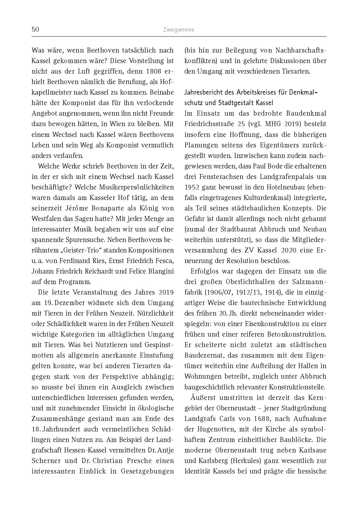 50 Zweigvereine Was wäre, wenn Beethoven tatsächlich nach Kassel gekommen wäre? Diese Vorstellung ist nicht aus der Luft gegriffen, denn 1808 erhielt Beethoven nämlich die Berufung, als Hofkapellmeister nach Kassel zu kommen. Beinahe hätte der Komponist das für ihn verlockende Angebot angenommen, wenn ihn nicht Freunde dazu bewogen hätten, in Wien zu bleiben. Mit einem Wechsel nach Kassel wären Beethovens Leben und sein Weg als Komponist vermutlich anders verlaufen. Welche Werke schrieb Beethoven in der Zeit, in der er sich mit einem Wechsel nach Kassel beschäftigte? Welche Musikerpersönlichkeiten waren damals am Kasseler Hof tätig, an dem seinerzeit Jérôme Bonaparte als König von Westfalen das Sagen hatte? Mit jeder Menge an interessanter Musik begaben wir uns auf eine spannende Spurensuche. Neben Beethovens berühmtem „Geister-Trio“ standen Kompositionen u. a. von Ferdinand Ries, Ernst Friedrich Fesca, Johann Friedrich Reichardt und Felice Blangini auf dem Programm. Die letzte Veranstaltung des Jahres 2019 am 19. Dezember widmete sich dem Umgang mit Tieren in der Frühen Neuzeit. Nützlichkeit oder Schädlichkeit waren in der Frühen Neuzeit wichtige Kategorien im alltäglichen Umgang mit Tieren. Was bei Nutztieren und Gespinstmotten als allgemein anerkannte Einstufung gelten konnte, war bei anderen Tierarten dagegen stark von der Perspektive abhängig; so musste bei ihnen ein Ausgleich zwischen unterschiedlichen Interessen gefunden werden, und mit zunehmender Einsicht in ökologische Zusammenhänge gestand man am Ende des 18. Jahrhundert auch vermeintlichen Schädlingen einen Nutzen zu. Am Beispiel der Landgrafschaft Hessen-Kassel vermittelten Dr. Antje Scherner und Dr. Christian Presche einen interessanten Einblick in Gesetzgebungen (bis hin zur Beilegung von Nachbarschaftskonflikten) und in gelehrte Diskussionen über den Umgang mit verschiedenen Tierarten. Jahresbericht des Arbeitskreises für Denkmalschutz und Stadtgestalt Kassel Im Einsatz um das bedrohte Baudenkmal Friedrichsstraße 25 (vgl. MHG 2019) besteht insofern eine Hoffnung, dass die bisherigen Planungen seitens des Eigentümers zurückgestellt wurden. Inzwischen kann zudem nachgewiesen werden, dass Paul Bode die erhaltenen drei Fensterachsen des Landgrafenpalais um 1952 ganz bewusst in den Hotelneubau (ebenfalls eingetragenes Kulturdenkmal) integrierte, als Teil seines städtebaulichen Konzepts. Die Gefahr ist damit allerdings noch nicht gebannt (zumal der Stadtbaurat Abbruch und Neubau weiterhin unterstützt), so dass die Mitgliederversammlung des ZV Kassel 2020 eine Erneuerung der Resolution beschloss. Erfolglos war dagegen der Einsatz um die drei großen Oberlichthallen der Salzmannfabrik (1906/07, 1912/13, 1914), die in einzigartiger Weise die bautechnische Entwicklung des frühen 20. Jh. direkt nebeneinander widerspiegeln: von einer Eisenkonstruktion zu einer frühen und einer reiferen Betonkonstruktion. Er scheiterte nicht zuletzt am städtischen Baudezernat, das zusammen mit dem Eigentümer weiterhin eine Aufteilung der Hallen in Wohnungen betreibt, zugleich unter Abbruch baugeschichtlich relevanter Konstruktionsteile. Äußerst umstritten ist derzeit das Kerngebiet der Oberneustadt – jener Stadtgründung Landgrafs Carls von 1688, nach Aufnahme der Hugenotten, mit der Kirche als symbolhaftem Zentrum einheitlicher Baublöcke. Die moderne Oberneustadt trug neben Karlsaue und Karlsberg (Herkules) ganz wesentlich zur Identität Kassels bei und prägte die hessische