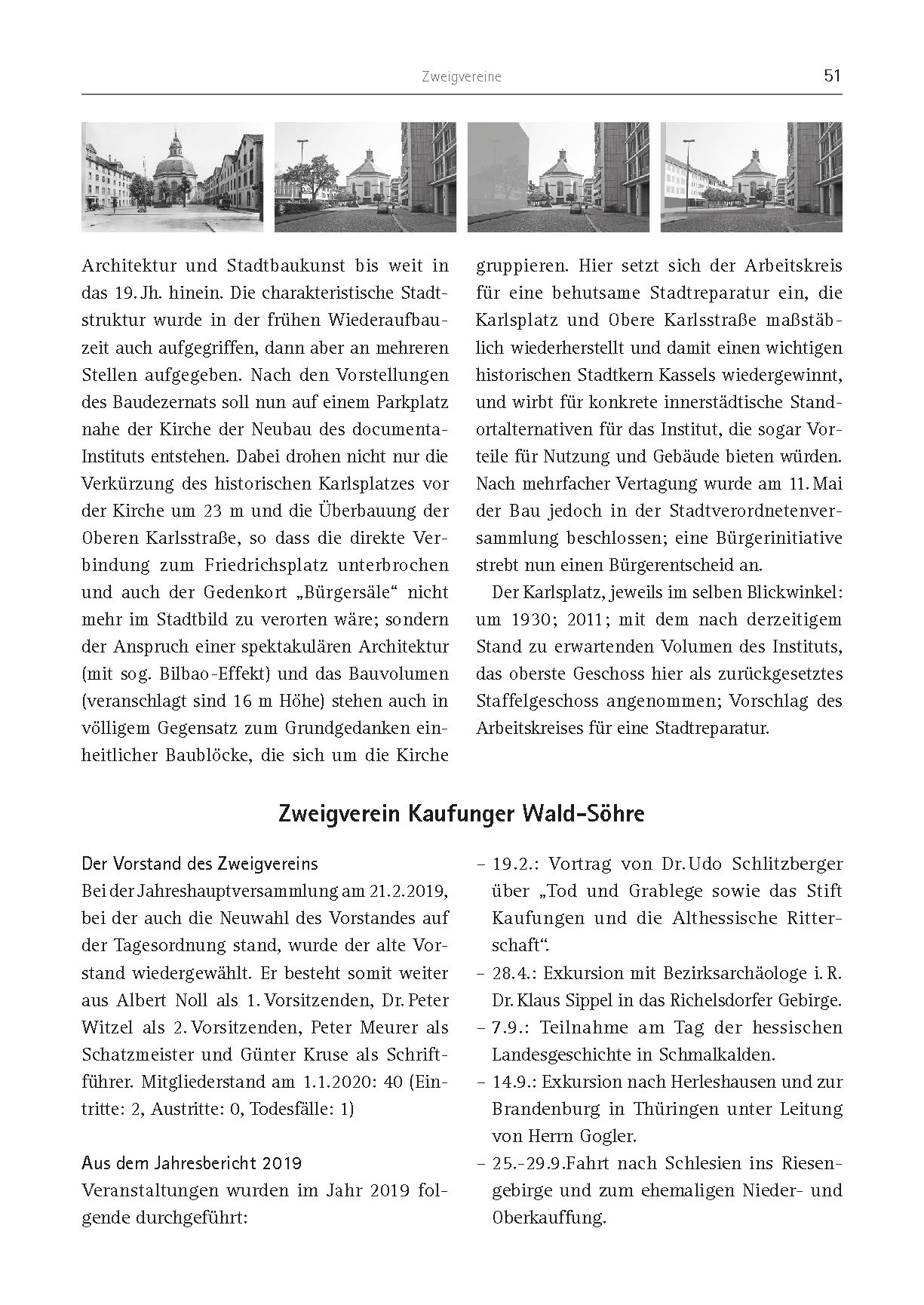 Zweigvereine 51 Zweigverein Kaufunger Wald-Söhre Der Vorstand des Zweigvereins Bei der Jahreshauptversammlung am 21.2.2019, bei der auch die Neuwahl des Vorstandes auf der Tagesordnung stand, wurde der alte Vorstand wiedergewählt. Er besteht somit weiter aus Albert Noll als 1. Vorsitzenden, Dr. Peter Witzel als 2. Vorsitzenden, Peter Meurer als Schatzmeister und Günter Kruse als Schriftführer. Mitgliederstand am 1.1.2020: 40 (Eintritte: 2, Austritte: 0, Todesfälle: 1) Aus dem Jahresbericht 2019 Veranstaltungen wurden im Jahr 2019 folgende durchgeführt: – 19.2.: Vortrag von Dr. Udo Schlitzberger über „Tod und Grablege sowie das Stift Kaufungen und die Althessische Ritterschaft“. – 28.4.: Exkursion mit Bezirksarchäologe i. R. Dr. Klaus Sippel in das Richelsdorfer Gebirge. – 7.9.: Teilnahme am Tag der hessischen Landesgeschichte in Schmalkalden. – 14.9.: Exkursion nach Herleshausen und zur Brandenburg in Thüringen unter Leitung von Herrn Gogler. – 25.-29.9.Fahrt nach Schlesien ins Riesengebirge und zum ehemaligen Nieder- und Oberkauffung. Architektur und Stadtbaukunst bis weit in das 19. Jh. hinein. Die charakteristische Stadtstruktur wurde in der frühen Wiederaufbauzeit auch aufgegriffen, dann aber an mehreren Stellen aufgegeben. Nach den Vorstellungen des Baudezernats soll nun auf einem Parkplatz nahe der Kirche der Neubau des documenta- Instituts entstehen. Dabei drohen nicht nur die Verkürzung des historischen Karlsplatzes vor der Kirche um 23 m und die Überbauung der Oberen Karlsstraße, so dass die direkte Verbindung zum Friedrichsplatz unterbrochen und auch der Gedenkort „Bürgersäle“ nicht mehr im Stadtbild zu verorten wäre; sondern der Anspruch einer spektakulären Architektur (mit sog. Bilbao-Effekt) und das Bauvolumen (veranschlagt sind 16 m Höhe) stehen auch in völligem Gegensatz zum Grundgedanken einheitlicher Baublöcke, die sich um die Kirche gruppieren. Hier setzt sich der Arbeitskreis für eine behutsame Stadtreparatur ein, die Karlsplatz und Obere Karlsstraße maßstäblich wiederherstellt und damit einen wichtigen historischen Stadtkern Kassels wiedergewinnt, und wirbt für konkrete innerstädtische Standortalternativen für das Institut, die sogar Vorteile für Nutzung und Gebäude bieten würden. Nach mehrfacher Vertagung wurde am 11. Mai der Bau jedoch in der Stadtverordnetenversammlung beschlossen; eine Bürgerinitiative strebt nun einen Bürgerentscheid an. Der Karlsplatz, jeweils im selben Blickwinkel: um 1930; 2011; mit dem nach derzeitigem Stand zu erwartenden Volumen des Instituts, das oberste Geschoss hier als zurückgesetztes Staffelgeschoss angenommen; Vorschlag des Arbeitskreises für eine Stadtreparatur.