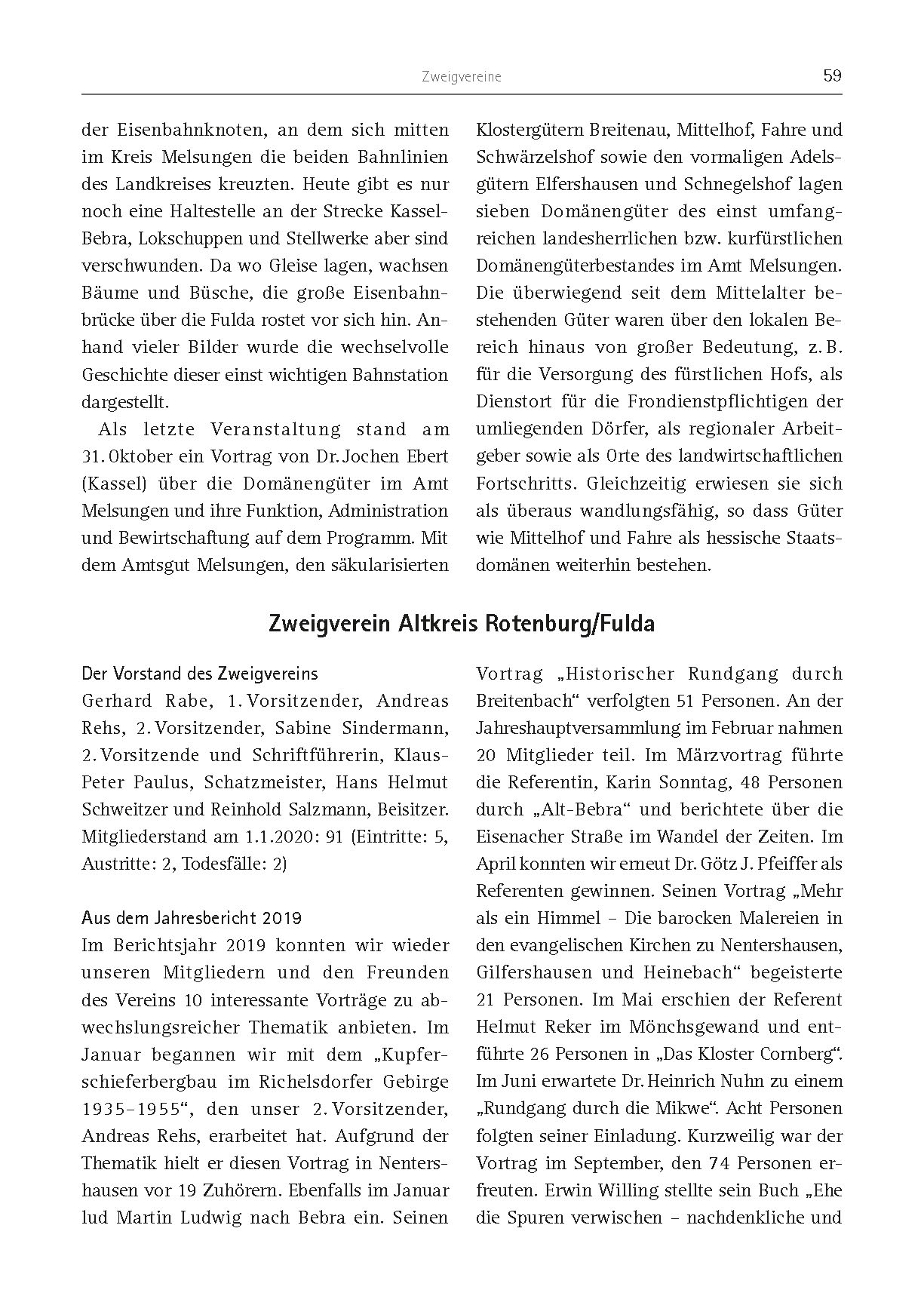 Zweigvereine 59 der Eisenbahnknoten, an dem sich mitten im Kreis Melsungen die beiden Bahnlinien des Landkreises kreuzten. Heute gibt es nur noch eine Haltestelle an der Strecke Kassel- Bebra, Lokschuppen und Stellwerke aber sind verschwunden. Da wo Gleise lagen, wachsen Bäume und Büsche, die große Eisenbahnbrücke über die Fulda rostet vor sich hin. Anhand vieler Bilder wurde die wechselvolle Geschichte dieser einst wichtigen Bahnstation dargestellt. Als letzte Veranstaltung stand am 31. Oktober ein Vortrag von Dr. Jochen Ebert (Kassel) über die Domänengüter im Amt Melsungen und ihre Funktion, Administration und Bewirtschaftung auf dem Programm. Mit dem Amtsgut Melsungen, den säkularisierten Klostergütern Breitenau, Mittelhof, Fahre und Schwärzelshof sowie den vormaligen Adelsgütern Elfershausen und Schnegelshof lagen sieben Domänengüter des einst umfangreichen landesherrlichen bzw. kurfürstlichen Domänengüterbestandes im Amt Melsungen. Die überwiegend seit dem Mittelalter bestehenden Güter waren über den lokalen Bereich hinaus von großer Bedeutung, z. B. für die Versorgung des fürstlichen Hofs, als Dienstort für die Frondienstpflichtigen der umliegenden Dörfer, als regionaler Arbeitgeber sowie als Orte des landwirtschaftlichen Fortschritts. Gleichzeitig erwiesen sie sich als überaus wandlungsfähig, so dass Güter wie Mittelhof und Fahre als hessische Staatsdomänen weiterhin bestehen. Der Vorstand des Zweigvereins Gerhard Rabe, 1. Vorsitzender, Andreas Rehs, 2. Vorsitzender, Sabine Sindermann, 2. Vorsitzende und Schriftführerin, Klaus- Peter Paulus, Schatzmeister, Hans Helmut Schweitzer und Reinhold Salzmann, Beisitzer. Mitgliederstand am 1.1.2020: 91 (Eintritte: 5, Austritte: 2, Todesfälle: 2) Aus dem Jahresbericht 2019 Im Berichtsjahr 2019 konnten wir wieder unseren Mitgliedern und den Freunden des Vereins 10 interessante Vorträge zu abwechslungsreicher Thematik anbieten. Im Januar begannen wir mit dem „Kupferschieferbergbau im Richelsdorfer Gebirge 1935–1955“, den unser 2. Vorsitzender, Andreas Rehs, erarbeitet hat. Aufgrund der Thematik hielt er diesen Vortrag in Nentershausen vor 19 Zuhörern. Ebenfalls im Januar lud Martin Ludwig nach Bebra ein. Seinen Vortrag „Historischer Rundgang durch Breitenbach“ verfolgten 51 Personen. An der Jahreshauptversammlung im Februar nahmen 20 Mitglieder teil. Im Märzvortrag führte die Referentin, Karin Sonntag, 48 Personen durch „Alt-Bebra“ und berichtete über die Eisenacher Straße im Wandel der Zeiten. Im April konnten wir erneut Dr. Götz J. Pfeiffer als Referenten gewinnen. Seinen Vortrag „Mehr als ein Himmel – Die barocken Malereien in den evangelischen Kirchen zu Nentershausen, Gilfershausen und Heinebach“ begeisterte 21 Personen. Im Mai erschien der Referent Helmut Reker im Mönchsgewand und entführte 26 Personen in „Das Kloster Cornberg“. Im Juni erwartete Dr. Heinrich Nuhn zu einem „Rundgang durch die Mikwe“. Acht Personen folgten seiner Einladung. Kurzweilig war der Vortrag im September, den 74 Personen erfreuten. Erwin Willing stellte sein Buch „Ehe die Spuren verwischen – nachdenkliche und Zweigverein Altkreis Rotenburg/Fulda