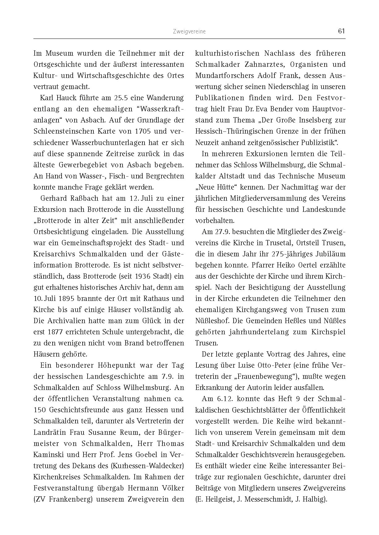 Zweigvereine 61 Im Museum wurden die Teilnehmer mit der Ortsgeschichte und der äußerst interessanten Kultur- und Wirtschaftsgeschichte des Ortes vertraut gemacht. Karl Hauck führte am 25.5 eine Wanderung entlang an den ehemaligen “Wasserkraftanlagen“ von Asbach. Auf der Grundlage der Schleensteinschen Karte von 1705 und verschiedener Wasserbuchunterlagen hat er sich auf diese spannende Zeitreise zurück in das älteste Gewerbegebiet von Asbach begeben. An Hand von Wasser-, Fisch- und Bergrechten konnte manche Frage geklärt werden. Gerhard Raßbach hat am 12. Juli zu einer Exkursion nach Brotterode in die Ausstellung „Brotterode in alter Zeit“ mit anschließender Ortsbesichtigung eingeladen. Die Ausstellung war ein Gemeinschaftsprojekt des Stadt- und Kreisarchivs Schmalkalden und der Gästeinformation Brotterode. Es ist nicht selbstverständlich, dass Brotterode (seit 1936 Stadt) ein gut erhaltenes historisches Archiv hat, denn am 10. Juli 1895 brannte der Ort mit Rathaus und Kirche bis auf einige Häuser vollständig ab. Die Archivalien hatte man zum Glück in der erst 1877 errichteten Schule untergebracht, die zu den wenigen nicht vom Brand betroffenen Häusern gehörte. Ein besonderer Höhepunkt war der Tag der hessischen Landesgeschichte am 7.9. in Schmalkalden auf Schloss Wilhelmsburg. An der öffentlichen Veranstaltung nahmen ca. 150 Geschichtsfreunde aus ganz Hessen und Schmalkalden teil, darunter als Vertreterin der Landrätin Frau Susanne Reum, der Bürgermeister von Schmalkalden, Herr Thomas Kaminski und Herr Prof. Jens Goebel in Vertretung des Dekans des (Kurhessen-Waldecker) Kirchenkreises Schmalkalden. Im Rahmen der Festveranstaltung übergab Hermann Völker (ZV Frankenberg) unserem Zweigverein den kulturhistorischen Nachlass des früheren Schmalkader Zahnarztes, Organisten und Mundartforschers Adolf Frank, dessen Auswertung sicher seinen Niederschlag in unseren Publikationen finden wird. Den Festvortrag hielt Frau Dr. Eva Bender vom Hauptvorstand zum Thema „Der Große Inselsberg zur Hessisch–Thüringischen Grenze in der frühen Neuzeit anhand zeitgenössischer Publizistik“. In mehreren Exkursionen lernten die Teilnehmer das Schloss Wilhelmsburg, die Schmalkalder Altstadt und das Technische Museum „Neue Hütte“ kennen. Der Nachmittag war der jährlichen Mitgliederversammlung des Vereins für hessischen Geschichte und Landeskunde vorbehalten. Am 27.9. besuchten die Mitglieder des Zweigvereins die Kirche in Trusetal, Ortsteil Trusen, die in diesem Jahr ihr 275-jähriges Jubiläum begehen konnte. Pfarrer Heiko Oertel erzählte aus der Geschichte der Kirche und ihrem Kirchspiel. Nach der Besichtigung der Ausstellung in der Kirche erkundeten die Teilnehmer den ehemaligen Kirchgangsweg von Trusen zum Nüßleshof. Die Gemeinden Heßles und Nüßles gehörten jahrhundertelang zum Kirchspiel Trusen. Der letzte geplante Vortrag des Jahres, eine Lesung über Luise Otto-Peter (eine frühe Vertreterin der „Frauenbewegung“), mußte wegen Erkrankung der Autorin leider ausfallen. Am 6.12. konnte das Heft 9 der Schmalkaldischen Geschichtsblätter der Öffentlichkeit vorgestellt werden. Die Reihe wird bekanntlich von unserem Verein gemeinsam mit dem Stadt- und Kreisarchiv Schmalkalden und dem Schmalkalder Geschichtsverein herausgegeben. Es enthält wieder eine Reihe interessanter Beiträge zur regionalen Geschichte, darunter drei Beiträge von Mitgliedern unseres Zweigvereins (E. Heilgeist, J. Messerschmidt, J. Halbig).