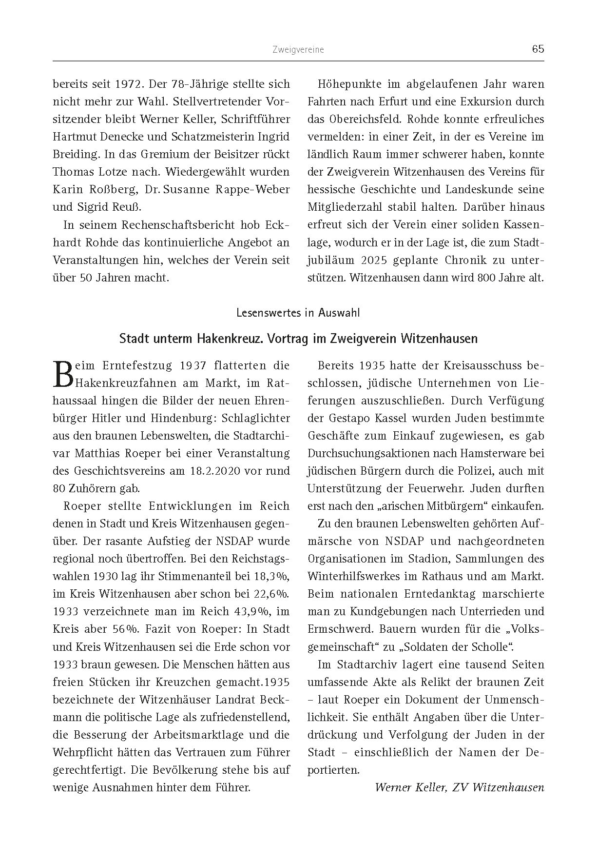 Zweigvereine 65 bereits seit 1972. Der 78-Jährige stellte sich nicht mehr zur Wahl. Stellvertretender Vorsitzender bleibt Werner Keller, Schriftführer Hartmut Denecke und Schatzmeisterin Ingrid Breiding. In das Gremium der Beisitzer rückt Thomas Lotze nach. Wiedergewählt wurden Karin Roßberg, Dr. Susanne Rappe-Weber und Sigrid Reuß. In seinem Rechenschaftsbericht hob Eckhardt Rohde das kontinuierliche Angebot an Veranstaltungen hin, welches der Verein seit über 50 Jahren macht. Höhepunkte im abgelaufenen Jahr waren Fahrten nach Erfurt und eine Exkursion durch das Obereichsfeld. Rohde konnte erfreuliches vermelden: in einer Zeit, in der es Vereine im ländlich Raum immer schwerer haben, konnte der Zweigverein Witzenhausen des Vereins für hessische Geschichte und Landeskunde seine Mitgliederzahl stabil halten. Darüber hinaus erfreut sich der Verein einer soliden Kassenlage, wodurch er in der Lage ist, die zum Stadtjubiläum 2025 geplante Chronik zu unterstützen. Witzenhausen dann wird 800 Jahre alt. Beim Erntefestzug 1937 flatterten die Hakenkreuzfahnen am Markt, im Rathaussaal hingen die Bilder der neuen Ehrenbürger Hitler und Hindenburg: Schlaglichter aus den braunen Lebenswelten, die Stadtarchivar Matthias Roeper bei einer Veranstaltung des Geschichtsvereins am 18.2.2020 vor rund 80 Zuhörern gab. Roeper stellte Entwicklungen im Reich denen in Stadt und Kreis Witzenhausen gegenüber. Der rasante Aufstieg der NSDAP wurde regional noch übertroffen. Bei den Reichstagswahlen 1930 lag ihr Stimmenanteil bei 18,3 %, im Kreis Witzenhausen aber schon bei 22,6 %. 1933 verzeichnete man im Reich 43,9 %, im Kreis aber 56 %. Fazit von Roeper: In Stadt und Kreis Witzenhausen sei die Erde schon vor 1933 braun gewesen. Die Menschen hätten aus freien Stücken ihr Kreuzchen gemacht.1935 bezeichnete der Witzenhäuser Landrat Beckmann die politische Lage als zufriedenstellend, die Besserung der Arbeitsmarktlage und die Wehrpflicht hätten das Vertrauen zum Führer gerechtfertigt. Die Bevölkerung stehe bis auf wenige Ausnahmen hinter dem Führer. Lesenswertes in Auswahl Stadt unterm Hakenkreuz. Vortrag im Zweigverein Witzenhausen Bereits 1935 hatte der Kreisausschuss beschlossen, jüdische Unternehmen von Lieferungen auszuschließen. Durch Verfügung der Gestapo Kassel wurden Juden bestimmte Geschäfte zum Einkauf zugewiesen, es gab Durchsuchungsaktionen nach Hamsterware bei jüdischen Bürgern durch die Polizei, auch mit Unterstützung der Feuerwehr. Juden durften erst nach den „arischen Mitbürgern“ einkaufen. Zu den braunen Lebenswelten gehörten Aufmärsche von NSDAP und nachgeordneten Organisationen im Stadion, Sammlungen des Winterhilfswerkes im Rathaus und am Markt. Beim nationalen Erntedanktag marschierte man zu Kundgebungen nach Unterrieden und Ermschwerd. Bauern wurden für die „Volksgemeinschaft“ zu „Soldaten der Scholle“. Im Stadtarchiv lagert eine tausend Seiten umfassende Akte als Relikt der braunen Zeit – laut Roeper ein Dokument der Unmenschlichkeit. Sie enthält Angaben über die Unterdrückung und Verfolgung der Juden in der Stadt – einschließlich der Namen der Deportierten. Werner Keller, ZV Witzenhausen