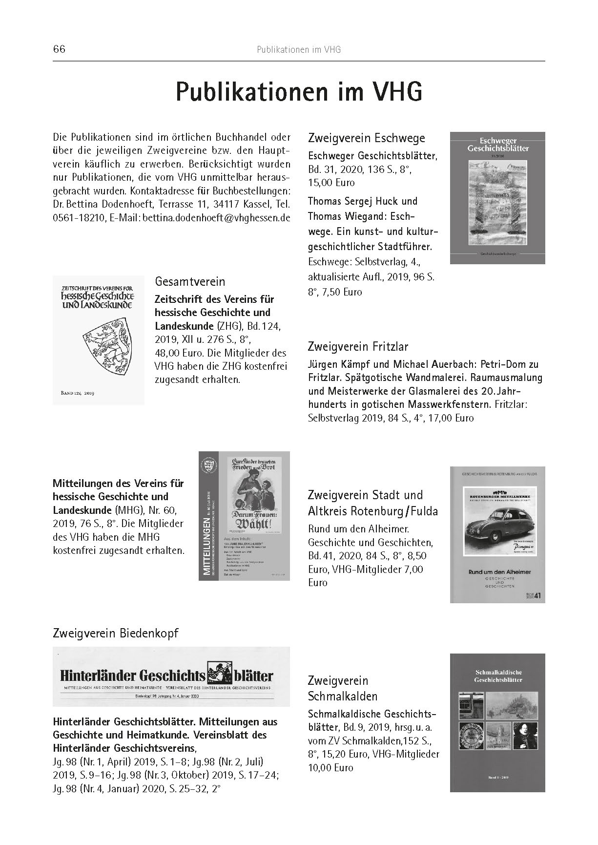 66 Publikationen im VHG Publikationen im VHG Zweigverein Eschwege Eschweger Geschichts blätter, Bd. 31, 2020, 136 S., 8°, 15,00 Euro Thomas Sergej Huck und Thomas Wiegand: Eschwege. Ein kunst- und kulturgeschichtlicher Stadtführer. Eschwege: Selbstverlag, 4., aktualisierte Aufl ., 2019, 96 S. 8°, 7,50 Euro Die Publikationen sind im örtlichen Buchhandel oder über die jeweiligen Zweigvereine bzw. den Hauptverein käuflich zu erwerben. Berücksichtigt wurden nur Publikationen, die vom VHG unmittelbar herausgebracht wurden. Kontaktadresse für Buchbestellungen: Dr. Bettina Dodenhoeft, Terrasse 11, 34117 Kassel, Tel. 0561-18210, E-Mail: bettina.dodenhoeft@vhghessen.de Zweigverein Fritzlar Jürgen Kämpf und Michael Auerbach: Petri-Dom zu Fritzlar. Spätgotische Wandmalerei. Raumausmalung und Meisterwerke der Glasmalerei des 20. Jahrhunderts in gotischen Masswerkfenstern. Fritzlar: Selbstverlag 2019, 84 S., 4°, 17,00 Euro Gesamtverein Zeitschrift des Vereins für hessische Geschichte und Landeskunde (ZHG), Bd. 124, 2019, XII u. 276 S., 8°, 48,00 Euro. Die Mitglieder des VHG haben die ZHG kostenfrei zugesandt erhalten. Zweigverein Stadt und Altkreis Rotenburg / Fulda Rund um den Alheimer. Geschichte und Geschichten, Bd. 41, 2020, 84 S., 8°, 8,50 Euro, VHG-Mitglieder 7,00 Euro Mitteilungen des Vereins für hessische Geschichte und Landeskunde (MHG), Nr. 60, 2019, 76 S., 8°. Die Mitglieder des VHG haben die MHG kostenfrei zugesandt erhalten. Zweigverein Biedenkopf Hinterländer Geschichtsblätter. Mitteilungen aus Geschichte und Heimatkunde. Vereinsblatt des Hinterländer Geschichtsvereins, Jg. 98 (Nr. 1, April) 2019, S. 1–8; Jg.98 (Nr. 2, Juli) 2019, S. 9–16; Jg. 98 (Nr. 3, Oktober) 2019, S. 17–24; Jg. 98 (Nr. 4, Januar) 2020, S. 25–32, 2° Zweigverein Schmalkalden Schmalkaldische Geschichtsblätter, Bd. 9, 2019, hrsg. u. a. vom ZV Schmalkalden,152 S., 8°, 15,20 Euro, VHG-Mitglieder 10,00 Euro