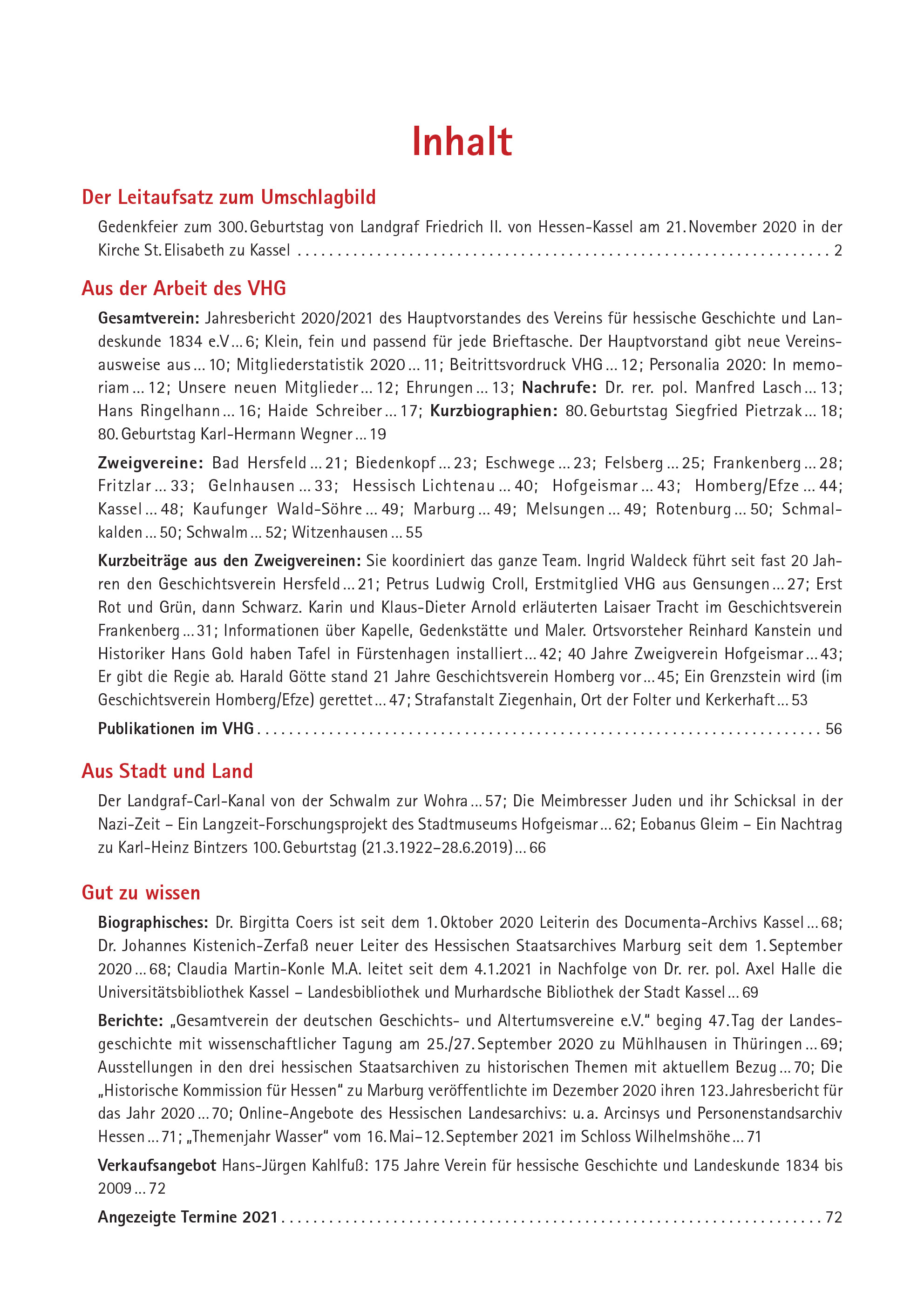 Inhalt Der Leitaufsatz zum Umschlagbild Gedenkfeier zum 300. Geburtstag von Landgraf Friedrich II. von Hessen-Kassel am 21. November 2020 in der Kirche St. Elisabeth zu Kassel . . . . . . . . . . . . . . . . . . . . . . . . . . . . . . . . . . . . . . . . . . . . . . . . . . . . . . . . . . . . . . . . . . . .2 Aus der Arbeit des VHG Gesamtverein: Jahresbericht 2020/2021 des Hauptvorstandes des Vereins für hessische Geschichte und Landeskunde 1834 e.V … 6; Klein, fein und passend für jede Brieftasche. Der Hauptvorstand gibt neue Vereinsausweise aus … 10; Mitgliederstatistik 2020 … 11; Beitrittsvordruck VHG … 12; Personalia 2020: In memoriam … 12; Unsere neuen Mitglieder … 12; Ehrungen … 13; Nachrufe: Dr. rer. pol. Manfred Lasch … 13; Hans Ringelhann … 16; Haide Schreiber … 17; Kurzbiographien: 80. Geburtstag Siegfried Pietrzak … 18; 80. Geburtstag Karl-Hermann Wegner … 19 Zweigvereine: Bad Hersfeld … 21; Biedenkopf … 23; Eschwege … 23; Felsberg … 25; Frankenberg … 28; Fritzlar … 33; Gelnhausen … 33; Hessisch Lichtenau … 40; Hofgeismar … 43; Homberg/ Efze … 44; Kassel … 48; Kaufunger Wald-Söhre … 49; Marburg … 49; Melsungen … 49; Rotenburg … 50; Schmalkalden … 50; Schwalm … 52; Witzenhausen … 55 Kurzbeiträge aus den Zweigvereinen: Sie koordiniert das ganze Team. Ingrid Waldeck führt seit fast 20 Jahren den Geschichtsverein Hersfeld … 21; Petrus Ludwig Croll, Erstmitglied VHG aus Gensungen … 27; Erst Rot und Grün, dann Schwarz. Karin und Klaus-Dieter Arnold erläuterten Laisaer Tracht im Geschichtsverein Frankenberg … 31; Informationen über Kapelle, Gedenkstätte und Maler. Ortsvorsteher Reinhard Kanstein und Historiker Hans Gold haben Tafel in Fürstenhagen installiert … 42; 40 Jahre Zweigverein Hofgeismar … 43; Er gibt die Regie ab. Harald Götte stand 21 Jahre Geschichtsverein Homberg vor … 45; Ein Grenzstein wird (im Geschichtsverein Homberg/Efze) gerettet … 47; Strafanstalt Ziegenhain, Ort der Folter und Kerkerhaft … 53 Publikationen im VHG. . . . . . . . . . . . . . . . . . . . . . . . . . . . . . . . . . . . . . . . . . . . . . . . . . . . . . . . . . . . . . . . . . . . . . . .56 Aus Stadt und Land Der Landgraf-Carl-Kanal von der Schwalm zur Wohra … 57; Die Meimbresser Juden und ihr Schicksal in der Nazi-Zeit – Ein Langzeit-Forschungsprojekt des Stadtmuseums Hofgeismar … 62; Eobanus Gleim – Ein Nachtrag zu Karl-Heinz Bintzers 100. Geburtstag (21.3.1922–28.6.2019) … 66 Gut zu wissen Biographisches: Dr. Birgitta Coers ist seit dem 1. Oktober 2020 Leiterin des Documenta-Archivs Kassel … 68; Dr. Johannes Kistenich-Zerfaß neuer Leiter des Hessischen Staatsarchives Marburg seit dem 1. September 2020 … 68; Claudia Martin-Konle M.A. leitet seit dem 4.1.2021 in Nachfolge von Dr. rer. pol. Axel Halle die Universitätsbibliothek Kassel – Landesbibliothek und Murhardsche Bibliothek der Stadt Kassel … 69 Berichte: „Gesamtverein der deutschen Geschichts- und Altertumsvereine e.V.“ beging 47. Tag der Landesgeschichte mit wissenschaftlicher Tagung am 25./27. September 2020 zu Mühlhausen in Thüringen … 69; Ausstellungen in den drei hessischen Staatsarchiven zu historischen Themen mit aktuellem Bezug … 70; Die „Historische Kommission für Hessen“ zu Marburg veröffentlichte im Dezember 2020 ihren 123. Jahresbericht für das Jahr 2020 … 70; Online-Angebote des Hessischen Landesarchivs: u. a. Arcinsys und Personenstandsarchiv Hessen … 71; „Themenjahr Wasser“ vom 16. Mai–12. September 2021 im Schloss Wilhelmshöhe … 71 Verkaufsangebot Hans-Jürgen Kahlfuß: 175 Jahre Verein für hessische Geschichte und Landeskunde 1834 bis 2009 … 72 Angezeigte Termine 2021. . . . . . . . . . . . . . . . . . . . . . . . . . . . . . . . . . . . . . . . . . . . . . . . . . . . . . . . . . . . . . . . . . . . .72