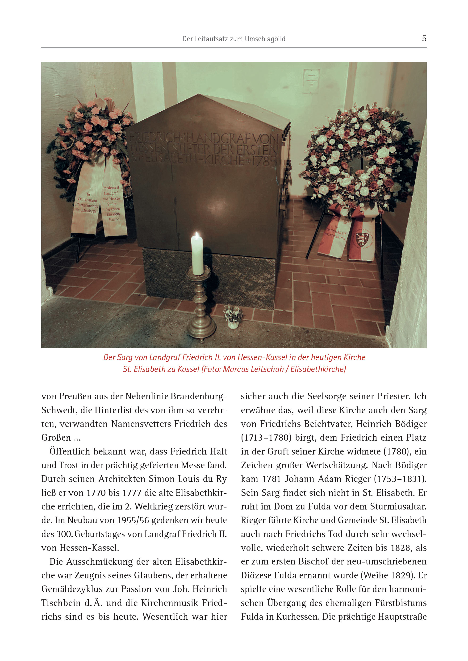 von Preußen aus der Nebenlinie Brandenburg- Schwedt, die Hinterlist des von ihm so verehrten, verwandten Namensvetters Friedrich des Großen … Öffentlich bekannt war, dass Friedrich Halt und Trost in der prächtig gefeierten Messe fand. Durch seinen Architekten Simon Louis du Ry ließ er von 1770 bis 1777 die alte Elisabethkirche errichten, die im 2. Weltkrieg zerstört wurde. Im Neubau von 1955/56 gedenken wir heute des 300. Geburtstages von Landgraf Friedrich II. von Hessen-Kassel. Die Ausschmückung der alten Elisabethkirche war Zeugnis seines Glaubens, der erhaltene Gemäldezyklus zur Passion von Joh. Heinrich Tischbein d. Ä. und die Kirchenmusik Friedrichs sind es bis heute. Wesentlich war hier sicher auch die Seelsorge seiner Priester. Ich erwähne das, weil diese Kirche auch den Sarg von Friedrichs Beichtvater, Heinrich Bödiger (1713–1780) birgt, dem Friedrich einen Platz in der Gruft seiner Kirche widmete (1780), ein Zeichen großer Wertschätzung. Nach Bödiger kam 1781 Johann Adam Rieger (1753–1831). Sein Sarg findet sich nicht in St. Elisabeth. Er ruht im Dom zu Fulda vor dem Sturmiusaltar. Rieger führte Kirche und Gemeinde St. Elisabeth auch nach Friedrichs Tod durch sehr wechselvolle, wiederholt schwere Zeiten bis 1828, als er zum ersten Bischof der neu-umschriebenen Diözese Fulda ernannt wurde (Weihe 1829). Er spielte eine wesentliche Rolle für den harmonischen Übergang des ehemaligen Fürstbistums Fulda in Kurhessen. Die prächtige Hauptstraße