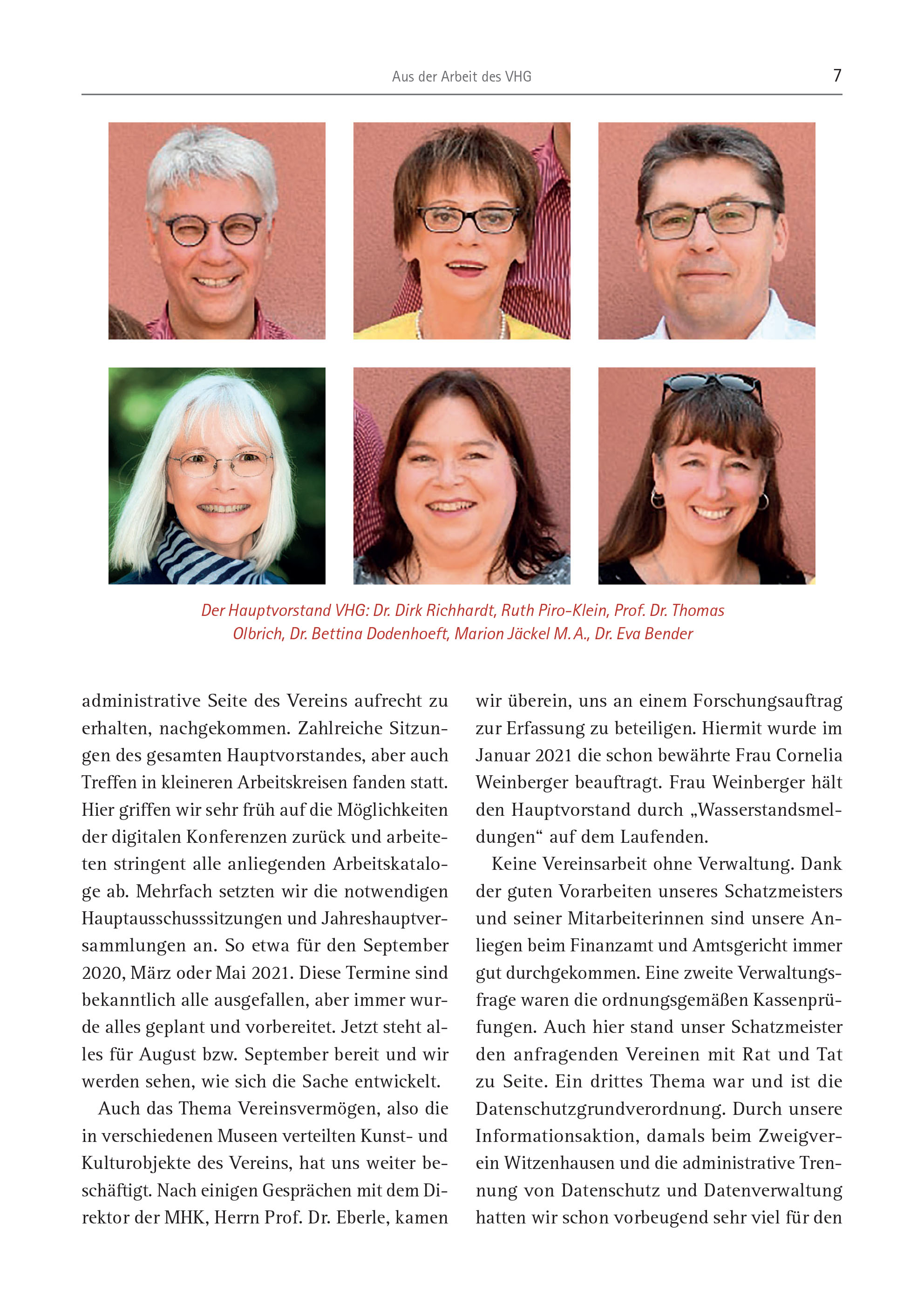 administrative Seite des Vereins aufrecht zu erhalten, nachgekommen. Zahlreiche Sitzungen des gesamten Hauptvorstandes, aber auch Treffen in kleineren Arbeitskreisen fanden statt. Hier griffen wir sehr früh auf die Möglichkeiten der digitalen Konferenzen zurück und arbeiteten stringent alle anliegenden Arbeitskataloge ab. Mehrfach setzten wir die notwendigen Hauptausschusssitzungen und Jahreshauptversammlungen an. So etwa für den September 2020, März oder Mai 2021. Diese Termine sind bekanntlich alle ausgefallen, aber immer wurde alles geplant und vorbereitet. Jetzt steht alles für August bzw. September bereit und wir werden sehen, wie sich die Sache entwickelt. Auch das Thema Vereinsvermögen, also die in verschiedenen Museen verteilten Kunst- und Kulturobjekte des Vereins, hat uns weiter beschäftigt. Nach einigen Gesprächen mit dem Direktor der MHK, Herrn Prof. Dr. Eberle, kamen wir überein, uns an einem Forschungsauftrag zur Erfassung zu beteiligen. Hiermit wurde im Januar 2021 die schon bewährte Frau Cornelia Weinberger beauftragt. Frau Weinberger hält den Hauptvorstand durch „Wasserstandsmeldungen“ auf dem Laufenden. Keine Vereinsarbeit ohne Verwaltung. Dank der guten Vorarbeiten unseres Schatzmeisters und seiner Mitarbeiterinnen sind unsere Anliegen beim Finanzamt und Amtsgericht immer gut durchgekommen. Eine zweite Verwaltungsfrage waren die ordnungsgemäßen Kassenprüfungen. Auch hier stand unser Schatzmeister den anfragenden Vereinen mit Rat und Tat zu Seite. Ein drittes Thema war und ist die Datenschutzgrundverordnung. Durch unsere Informationsaktion, damals beim Zweigverein Witzenhausen und die administrative Trennung von Datenschutz und Datenverwaltung hatten wir schon vorbeugend sehr viel für den