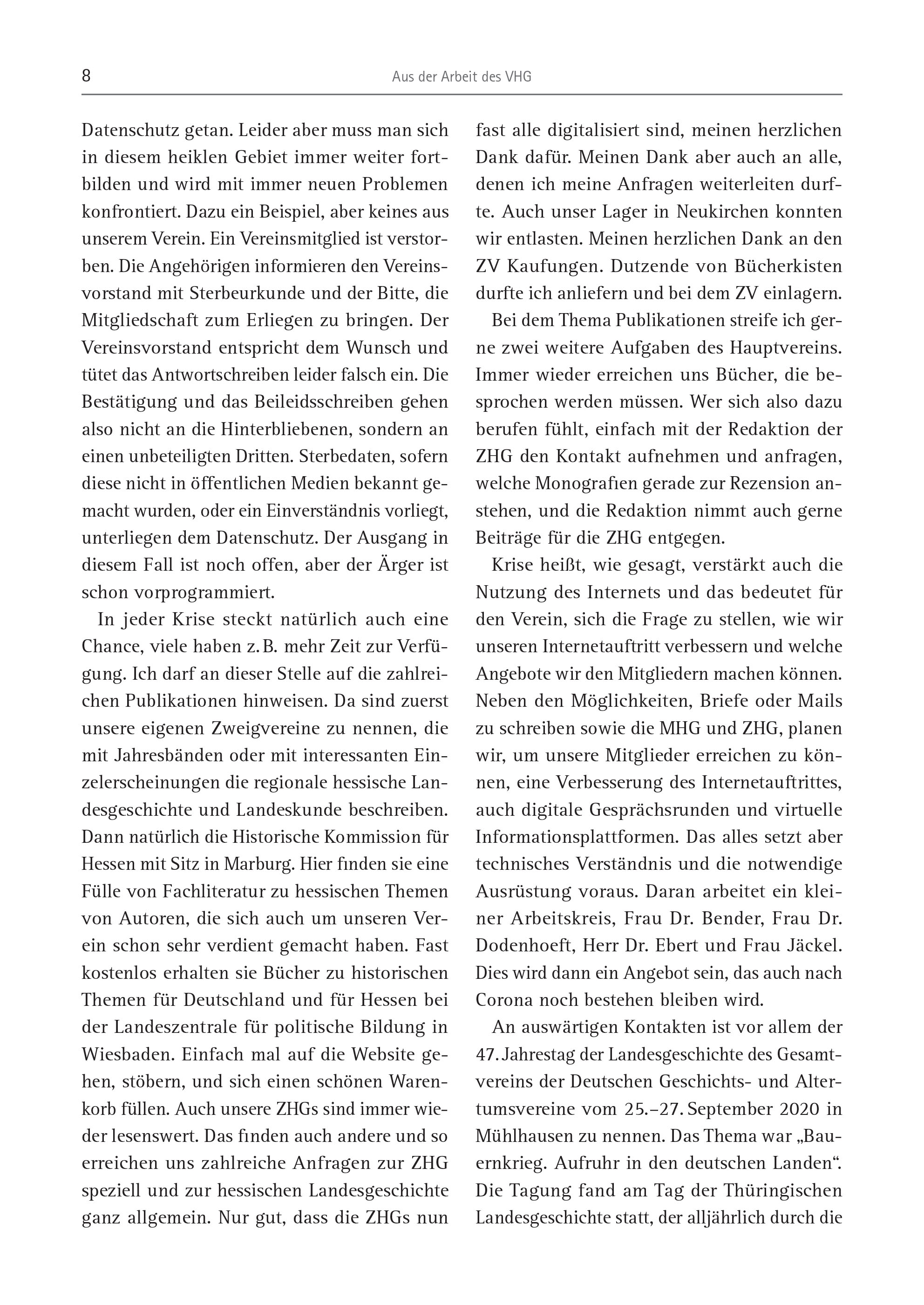 8 Aus der Arbeit des VHG Datenschutz getan. Leider aber muss man sich in diesem heiklen Gebiet immer weiter fortbilden und wird mit immer neuen Problemen konfrontiert. Dazu ein Beispiel, aber keines aus unserem Verein. Ein Vereinsmitglied ist verstorben. Die Angehörigen informieren den Vereinsvorstand mit Sterbeurkunde und der Bitte, die Mitgliedschaft zum Erliegen zu bringen. Der Vereinsvorstand entspricht dem Wunsch und tütet das Antwortschreiben leider falsch ein. Die Bestätigung und das Beileidsschreiben gehen also nicht an die Hinterbliebenen, sondern an einen unbeteiligten Dritten. Sterbedaten, sofern diese nicht in öffentlichen Medien bekannt gemacht wurden, oder ein Einverständnis vorliegt, unterliegen dem Datenschutz. Der Ausgang in diesem Fall ist noch offen, aber der Ärger ist schon vorprogrammiert. In jeder Krise steckt natürlich auch eine Chance, viele haben z. B. mehr Zeit zur Verfügung. Ich darf an dieser Stelle auf die zahlreichen Publikationen hinweisen. Da sind zuerst unsere eigenen Zweigvereine zu nennen, die mit Jahresbänden oder mit interessanten Einzelerscheinungen die regionale hessische Landesgeschichte und Landeskunde beschreiben. Dann natürlich die Historische Kommission für Hessen mit Sitz in Marburg. Hier finden sie eine Fülle von Fachliteratur zu hessischen Themen von Autoren, die sich auch um unseren Verein schon sehr verdient gemacht haben. Fast kostenlos erhalten sie Bücher zu historischen Themen für Deutschland und für Hessen bei der Landeszentrale für politische Bildung in Wiesbaden. Einfach mal auf die Website gehen, stöbern, und sich einen schönen Warenkorb füllen. Auch unsere ZHGs sind immer wieder lesenswert. Das finden auch andere und so erreichen uns zahlreiche Anfragen zur ZHG speziell und zur hessischen Landesgeschichte ganz allgemein. Nur gut, dass die ZHGs nun fast alle digitalisiert sind, meinen herzlichen Dank dafür. Meinen Dank aber auch an alle, denen ich meine Anfragen weiterleiten durfte. Auch unser Lager in Neukirchen konnten wir entlasten. Meinen herzlichen Dank an den ZV Kaufungen. Dutzende von Bücherkisten durfte ich anliefern und bei dem ZV einlagern. Bei dem Thema Publikationen streife ich gerne zwei weitere Aufgaben des Hauptvereins. Immer wieder erreichen uns Bücher, die besprochen werden müssen. Wer sich also dazu berufen fühlt, einfach mit der Redaktion der ZHG den Kontakt aufnehmen und anfragen, welche Monografien gerade zur Rezension anstehen, und die Redaktion nimmt auch gerne Beiträge für die ZHG entgegen. Krise heißt, wie gesagt, verstärkt auch die Nutzung des Internets und das bedeutet für den Verein, sich die Frage zu stellen, wie wir unseren Internetauftritt verbessern und welche Angebote wir den Mitgliedern machen können. Neben den Möglichkeiten, Briefe oder Mails zu schreiben sowie die MHG und ZHG, planen wir, um unsere Mitglieder erreichen zu können, eine Verbesserung des Internetauftrittes, auch digitale Gesprächsrunden und virtuelle Informationsplattformen. Das alles setzt aber technisches Verständnis und die notwendige Ausrüstung voraus. Daran arbeitet ein kleiner Arbeitskreis, Frau Dr. Bender, Frau Dr. Dodenhoeft, Herr Dr. Ebert und Frau Jäckel. Dies wird dann ein Angebot sein, das auch nach Corona noch bestehen bleiben wird. An auswärtigen Kontakten ist vor allem der 47. Jahrestag der Landesgeschichte des Gesamtvereins der Deutschen Geschichts- und Altertumsvereine vom 25.–27. September 2020 in Mühlhausen zu nennen. Das Thema war „Bauernkrieg. Aufruhr in den deutschen Landen“. Die Tagung fand am Tag der Thüringischen Landesgeschichte statt, der alljährlich durch die