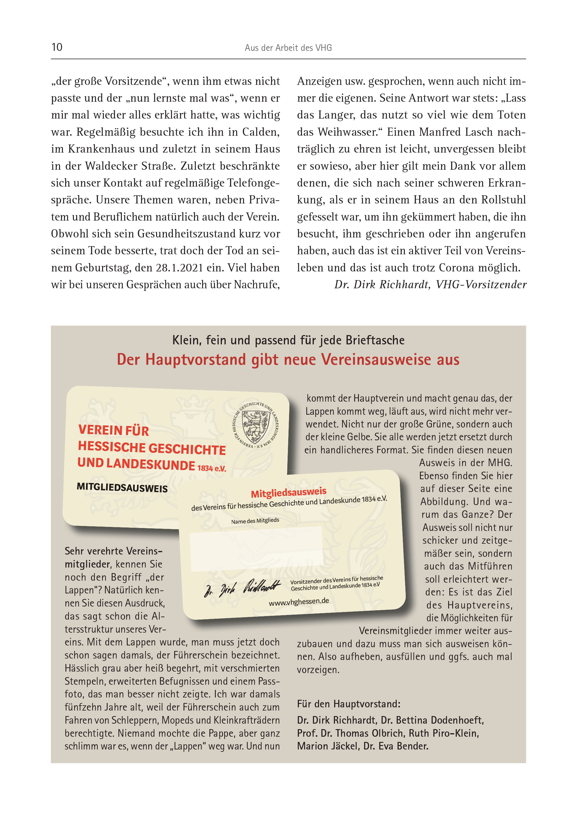 10 Aus der Arbeit des VHG „der große Vorsitzende“, wenn ihm etwas nicht passte und der „nun lernste mal was“, wenn er mir mal wieder alles erklärt hatte, was wichtig war. Regelmäßig besuchte ich ihn in Calden, im Krankenhaus und zuletzt in seinem Haus in der Waldecker Straße. Zuletzt beschränkte sich unser Kontakt auf regelmäßige Telefongespräche. Unsere Themen waren, neben Privatem und Berufl ichem natürlich auch der Verein. Obwohl sich sein Gesundheitszustand kurz vor seinem Tode besserte, trat doch der Tod an seinem Geburtstag, den 28.1.2021 ein. Viel haben wir bei unseren Gesprächen auch über Nachrufe, Anzeigen usw. gesprochen, wenn auch nicht immer die eigenen. Seine Antwort war stets: „Lass das Langer, das nutzt so viel wie dem Toten das Weihwasser.“ Einen Manfred Lasch nachträglich zu ehren ist leicht, unvergessen bleibt er sowieso, aber hier gilt mein Dank vor allem denen, die sich nach seiner schweren Erkrankung, als er in seinem Haus an den Rollstuhl gefesselt war, um ihn gekümmert haben, die ihn besucht, ihm geschrieben oder ihn angerufen haben, auch das ist ein aktiver Teil von Vereinsleben und das ist auch trotz Corona möglich. Dr. Dirk Richhardt, VHG-Vorsitzender Sehr verehrte Vereinsmitglieder, kennen Sie noch den Begriff „der Lappen“? Natürlich kennen Sie diesen Ausdruck, das sagt schon die Altersstruktur unseres Vereins. Mit dem Lappen wurde, man muss jetzt doch schon sagen damals, der Führerschein bezeichnet. Hässlich grau aber heiß begehrt, mit verschmierten Stempeln, erweiterten Befugnissen und einem Passfoto, das man besser nicht zeigte. Ich war damals fünfzehn Jahre alt, weil der Führerschein auch zum Fahren von Schleppern, Mopeds und Kleinkrafträdern berechtigte. Niemand mochte die Pappe, aber ganz schlimm war es, wenn der „Lappen“ weg war. Und nun kommt der Hauptverein und macht genau das, der Lappen kommt weg, läuft aus, wird nicht mehr verwendet. Nicht nur der große Grüne, sondern auch der kleine Gelbe. Sie alle werden jetzt ersetzt durch ein handlicheres Format. Sie fi nden diesen neuen Ausweis in der MHG. Ebenso fi nden Sie hier auf dieser Seite eine Abbildung. Und warum das Ganze? Der Ausweis soll nicht nur schicker und zeitgemäßer sein, sondern auch das Mitführen soll erleichtert werden: Es ist das Ziel des Hauptvereins, die Möglichkeiten für Vereinsmitglieder immer weiter auszubauen und dazu muss man sich ausweisen können. Also aufheben, ausfüllen und ggfs. auch mal vorzeigen. Für den Hauptvorstand: Dr. Dirk Richhardt, Dr. Bettina Dodenhoeft, Prof. Dr. Thomas Olbrich, Ruth Piro-Klein, Marion Jäckel, Dr. Eva Bender. Klein, fein und passend für jede Brieftasche Der Hauptvorstand gibt neue Vereinsausweise aus VEREIN FÜRHESSISCHE GESCHIC HTE UND LANDESKUNDE 1834 E.V.V • VEREIN FÜR HESSISCHE GESCHICHTE UND LANDESKUNDE 1834 e.V. MITGLIEDSAUSWEIS aus- Name des Mitglieds www.vhghessen.de