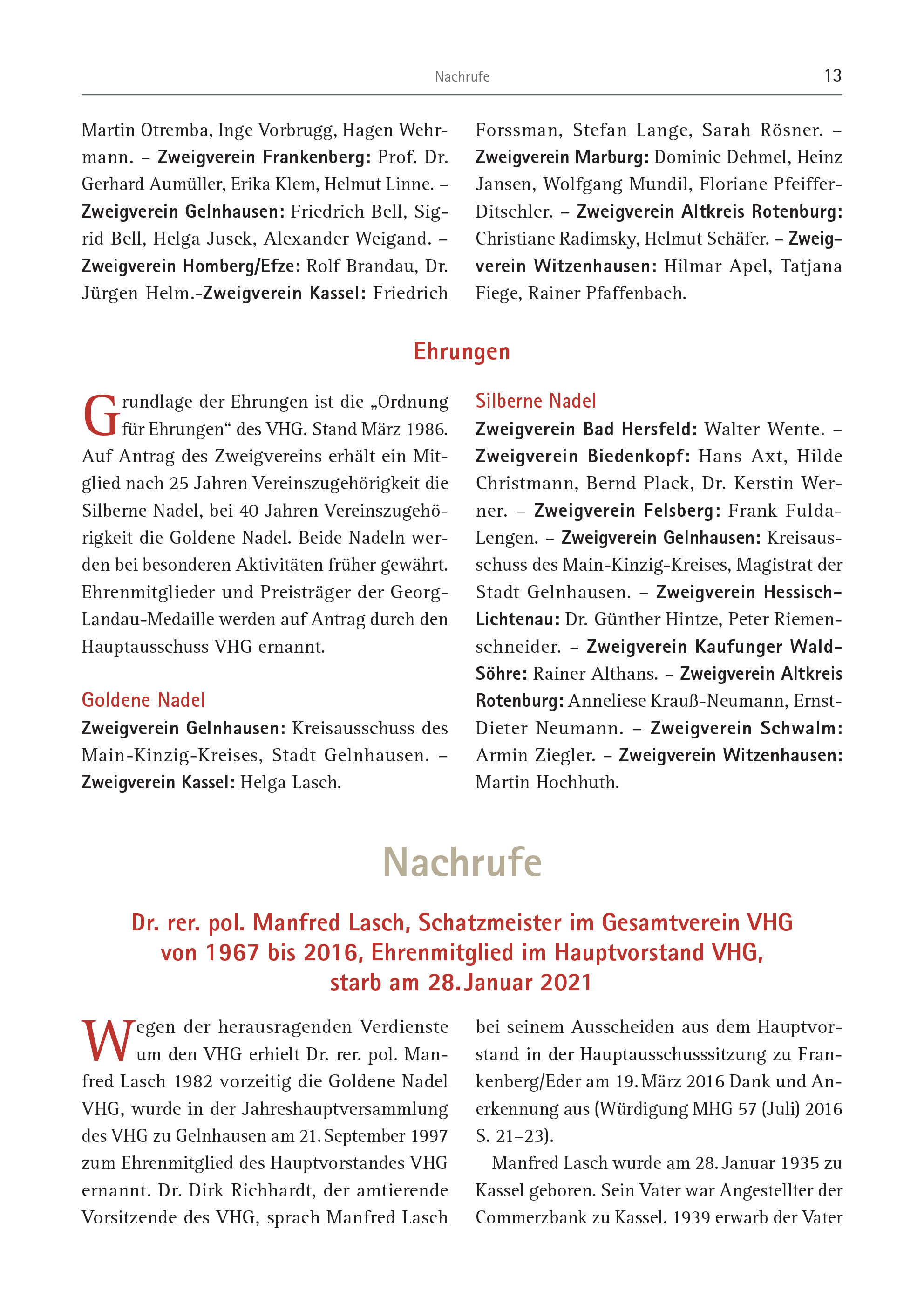 Nachrufe 13 Martin Otremba, Inge Vorbrugg, Hagen Wehrmann. – Zweigverein Frankenberg: Prof. Dr. Gerhard Aumüller, Erika Klem, Helmut Linne. – Zweigverein Gelnhausen: Friedrich Bell, Sigrid Bell, Helga Jusek, Alexander Weigand. – Zweigverein Homberg/Efze: Rolf Brandau, Dr. Jürgen Helm.-Zweigverein Kassel: Friedrich Forssman, Stefan Lange, Sarah Rösner. – Zweigverein Marburg: Dominic Dehmel, Heinz Jansen, Wolfgang Mundil, Floriane Pfeiffer- Ditschler. – Zweigverein Altkreis Rotenburg: Christiane Radimsky, Helmut Schäfer. – Zweigverein Witzenhausen: Hilmar Apel, Tatjana Fiege, Rainer Pfaffenbach. Ehrungen Grundlage der Ehrungen ist die „Ordnung für Ehrungen“ des VHG. Stand März 1986. Auf Antrag des Zweigvereins erhält ein Mitglied nach 25 Jahren Vereinszugehörigkeit die Silberne Nadel, bei 40 Jahren Vereinszugehörigkeit die Goldene Nadel. Beide Nadeln werden bei besonderen Aktivitäten früher gewährt. Ehrenmitglieder und Preisträger der Georg-Landau- Medaille werden auf Antrag durch den Hauptausschuss VHG ernannt. Goldene Nadel Zweigverein Gelnhausen: Kreisausschuss des Main-Kinzig-Kreises, Stadt Gelnhausen. – Zweigverein Kassel: Helga Lasch. Silberne Nadel Zweigverein Bad Hersfeld: Walter Wente. – Zweigverein Biedenkopf: Hans Axt, Hilde Christmann, Bernd Plack, Dr. Kerstin Werner. – Zweigverein Felsberg: Frank Fulda-Lengen. – Zweigverein Gelnhausen: Kreisausschuss des Main-Kinzig-Kreises, Magistrat der Stadt Gelnhausen. – Zweigverein Hessisch-Lichtenau: Dr. Günther Hintze, Peter Riemenschneider. – Zweigverein Kaufunger Wald- Söhre: Rainer Althans. – Zweigverein Altkreis Rotenburg: Anneliese Krauß-Neumann, Ernst- Dieter Neumann. – Zweigverein Schwalm: Armin Ziegler. – Zweigverein Witzenhausen: Martin Hochhuth. Nachrufe Dr. rer. pol. Manfred Lasch, Schatzmeister im Gesamtverein VHG von 1967 bis 2016, Ehrenmitglied im Hauptvorstand VHG, starb am 28. Januar 2021 Wegen der herausragenden Verdienste um den VHG erhielt Dr. rer. pol. Manfred Lasch 1982 vorzeitig die Goldene Nadel VHG, wurde in der Jahreshauptversammlung des VHG zu Gelnhausen am 21. September 1997 zum Ehrenmitglied des Hauptvorstandes VHG ernannt. Dr. Dirk Richhardt, der amtierende Vorsitzende des VHG, sprach Manfred Lasch bei seinem Ausscheiden aus dem Hauptvorstand in der Hauptausschusssitzung zu Frankenberg/ Eder am 19. März 2016 Dank und Anerkennung aus (Würdigung MHG 57 (Juli) 2016 S. 21–23). Manfred Lasch wurde am 28. Januar 1935 zu Kassel geboren. Sein Vater war Angestellter der Commerzbank zu Kassel. 1939 erwarb der Vater