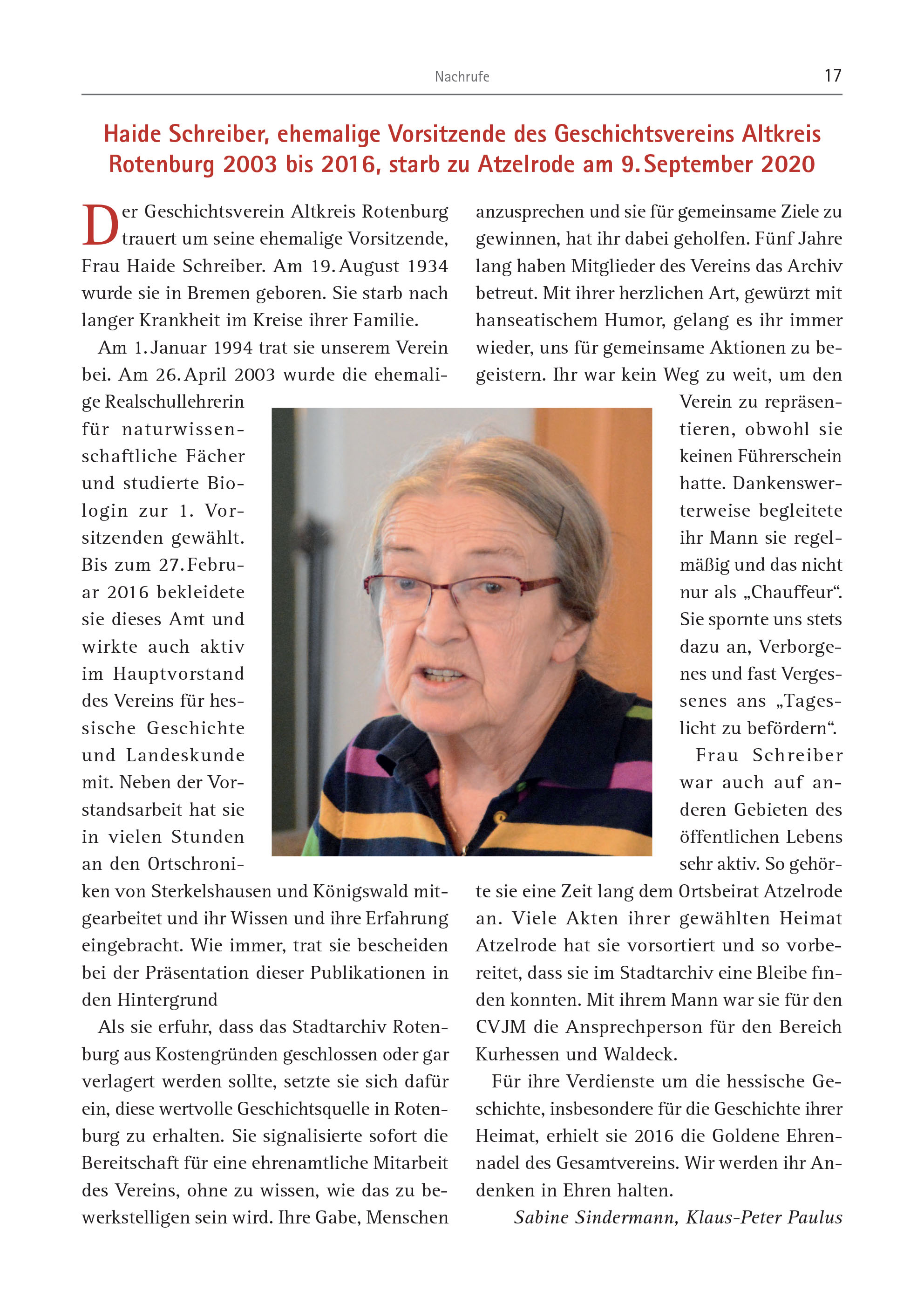 Nachrufe 17 Haide Schreiber, ehemalige Vorsitzende des Geschichtsvereins Altkreis Rotenburg 2003 bis 2016, starb zu Atzelrode am 9. September 2020 Der Geschichtsverein Altkreis Rotenburg trauert um seine ehemalige Vorsitzende, Frau Haide Schreiber. Am 19. August 1934 wurde sie in Bremen geboren. Sie starb nach langer Krankheit im Kreise ihrer Familie. Am 1. Januar 1994 trat sie unserem Verein bei. Am 26. April 2003 wurde die ehemalige Realschullehrerin für naturwissenschaftliche Fächer und studierte Biologin zur 1. Vorsitzenden gewählt. Bis zum 27. Februar 2016 bekleidete sie dieses Amt und wirkte auch aktiv im Hauptvorstand des Vereins für hessische Geschichte und Landeskunde mit. Neben der Vorstandsarbeit hat sie in vielen Stunden an den Ortschroniken von Sterkelshausen und Königswald mitgearbeitet und ihr Wissen und ihre Erfahrung eingebracht. Wie immer, trat sie bescheiden bei der Präsentation dieser Publikationen in den Hintergrund Als sie erfuhr, dass das Stadtarchiv Rotenburg aus Kostengründen geschlossen oder gar verlagert werden sollte, setzte sie sich dafür ein, diese wertvolle Geschichtsquelle in Rotenburg zu erhalten. Sie signalisierte sofort die Bereitschaft für eine ehrenamtliche Mitarbeit des Vereins, ohne zu wissen, wie das zu bewerkstelligen sein wird. Ihre Gabe, Menschen anzusprechen und sie für gemeinsame Ziele zu gewinnen, hat ihr dabei geholfen. Fünf Jahre lang haben Mitglieder des Vereins das Archiv betreut. Mit ihrer herzlichen Art, gewürzt mit hanseatischem Humor, gelang es ihr immer wieder, uns für gemeinsame Aktionen zu begeistern. Ihr war kein Weg zu weit, um den Verein zu repräsentieren, obwohl sie keinen Führerschein hatte. Dankenswerterweise begleitete ihr Mann sie regelmäßig und das nicht nur als „Chauffeur“. Sie spornte uns stets dazu an, Verborgenes und fast Vergessenes ans „Tageslicht zu befördern“. Frau Schreiber war auch auf anderen Gebieten des öffentlichen Lebens sehr aktiv. So gehörte sie eine Zeit lang dem Ortsbeirat Atzelrode an. Viele Akten ihrer gewählten Heimat Atzelrode hat sie vorsortiert und so vorbereitet, dass sie im Stadtarchiv eine Bleibe finden konnten. Mit ihrem Mann war sie für den CVJM die Ansprechperson für den Bereich Kurhessen und Waldeck. Für ihre Verdienste um die hessische Geschichte, insbesondere für die Geschichte ihrer Heimat, erhielt sie 2016 die Goldene Ehrennadel des Gesamtvereins. Wir werden ihr Andenken in Ehren halten. Sabine Sindermann, Klaus-Peter Paulus