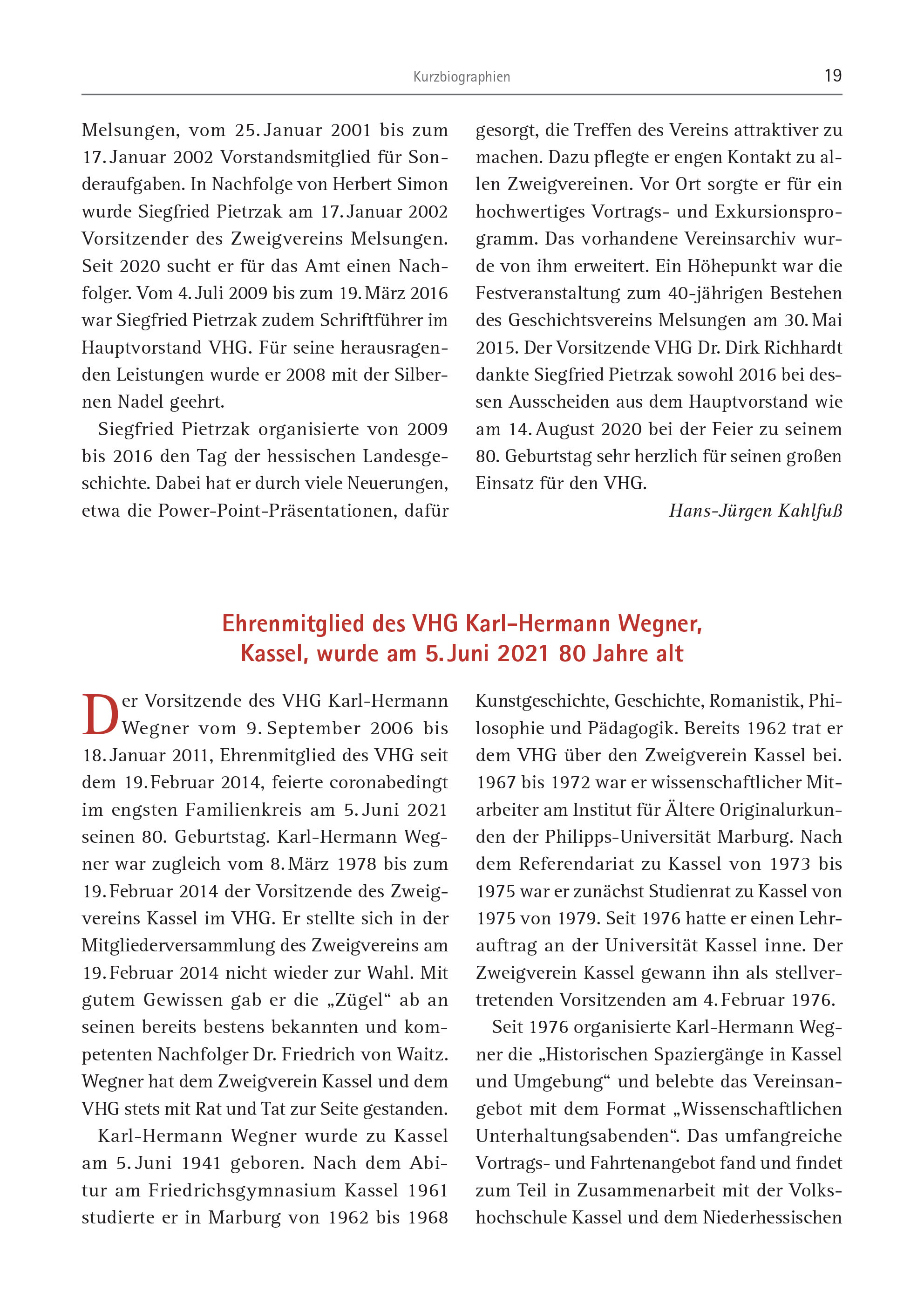 Kurzbiographien 19 Melsungen, vom 25. Januar 2001 bis zum 17. Januar 2002 Vorstandsmitglied für Sonderaufgaben. In Nachfolge von Herbert Simon wurde Siegfried Pietrzak am 17. Januar 2002 Vorsitzender des Zweigvereins Melsungen. Seit 2020 sucht er für das Amt einen Nachfolger. Vom 4. Juli 2009 bis zum 19. März 2016 war Siegfried Pietrzak zudem Schriftführer im Hauptvorstand VHG. Für seine herausragenden Leistungen wurde er 2008 mit der Silbernen Nadel geehrt. Siegfried Pietrzak organisierte von 2009 bis 2016 den Tag der hessischen Landesgeschichte. Dabei hat er durch viele Neuerungen, etwa die Power-Point-Präsentationen, dafür gesorgt, die Treffen des Vereins attraktiver zu machen. Dazu pflegte er engen Kontakt zu allen Zweigvereinen. Vor Ort sorgte er für ein hochwertiges Vortrags- und Exkursionsprogramm. Das vorhandene Vereinsarchiv wurde von ihm erweitert. Ein Höhepunkt war die Festveranstaltung zum 40-jährigen Bestehen des Geschichtsvereins Melsungen am 30. Mai 2015. Der Vorsitzende VHG Dr. Dirk Richhardt dankte Siegfried Pietrzak sowohl 2016 bei dessen Ausscheiden aus dem Hauptvorstand wie am 14. August 2020 bei der Feier zu seinem 80. Geburtstag sehr herzlich für seinen großen Einsatz für den VHG. Hans-Jürgen Kahlfuß Der Vorsitzende des VHG Karl-Hermann Wegner vom 9. September 2006 bis 18. Januar 2011, Ehrenmitglied des VHG seit dem 19. Februar 2014, feierte coronabedingt im engsten Familienkreis am 5. Juni 2021 seinen 80. Geburtstag. Karl-Hermann Wegner war zugleich vom 8. März 1978 bis zum 19. Februar 2014 der Vorsitzende des Zweigvereins Kassel im VHG. Er stellte sich in der Mitgliederversammlung des Zweigvereins am 19. Februar 2014 nicht wieder zur Wahl. Mit gutem Gewissen gab er die „Zügel“ ab an seinen bereits bestens bekannten und kompetenten Nachfolger Dr. Friedrich von Waitz. Wegner hat dem Zweigverein Kassel und dem VHG stets mit Rat und Tat zur Seite gestanden. Karl-Hermann Wegner wurde zu Kassel am 5. Juni 1941 geboren. Nach dem Abitur am Friedrichsgymnasium Kassel 1961 studierte er in Marburg von 1962 bis 1968 Kunstgeschichte, Geschichte, Romanistik, Philosophie und Pädagogik. Bereits 1962 trat er dem VHG über den Zweigverein Kassel bei. 1967 bis 1972 war er wissenschaftlicher Mitarbeiter am Institut für Ältere Originalurkunden der Philipps-Universität Marburg. Nach dem Referendariat zu Kassel von 1973 bis 1975 war er zunächst Studienrat zu Kassel von 1975 von 1979. Seit 1976 hatte er einen Lehrauftrag an der Universität Kassel inne. Der Zweigverein Kassel gewann ihn als stellvertretenden Vorsitzenden am 4. Februar 1976. Seit 1976 organisierte Karl-Hermann Wegner die „Historischen Spaziergänge in Kassel und Umgebung“ und belebte das Vereinsangebot mit dem Format „Wissenschaftlichen Unterhaltungsabenden“. Das umfangreiche Vortrags- und Fahrtenangebot fand und findet zum Teil in Zusammenarbeit mit der Volkshochschule Kassel und dem Niederhessischen Ehrenmitglied des VHG Karl-Hermann Wegner, Kassel, wurde am 5. Juni 2021 80 Jahre alt