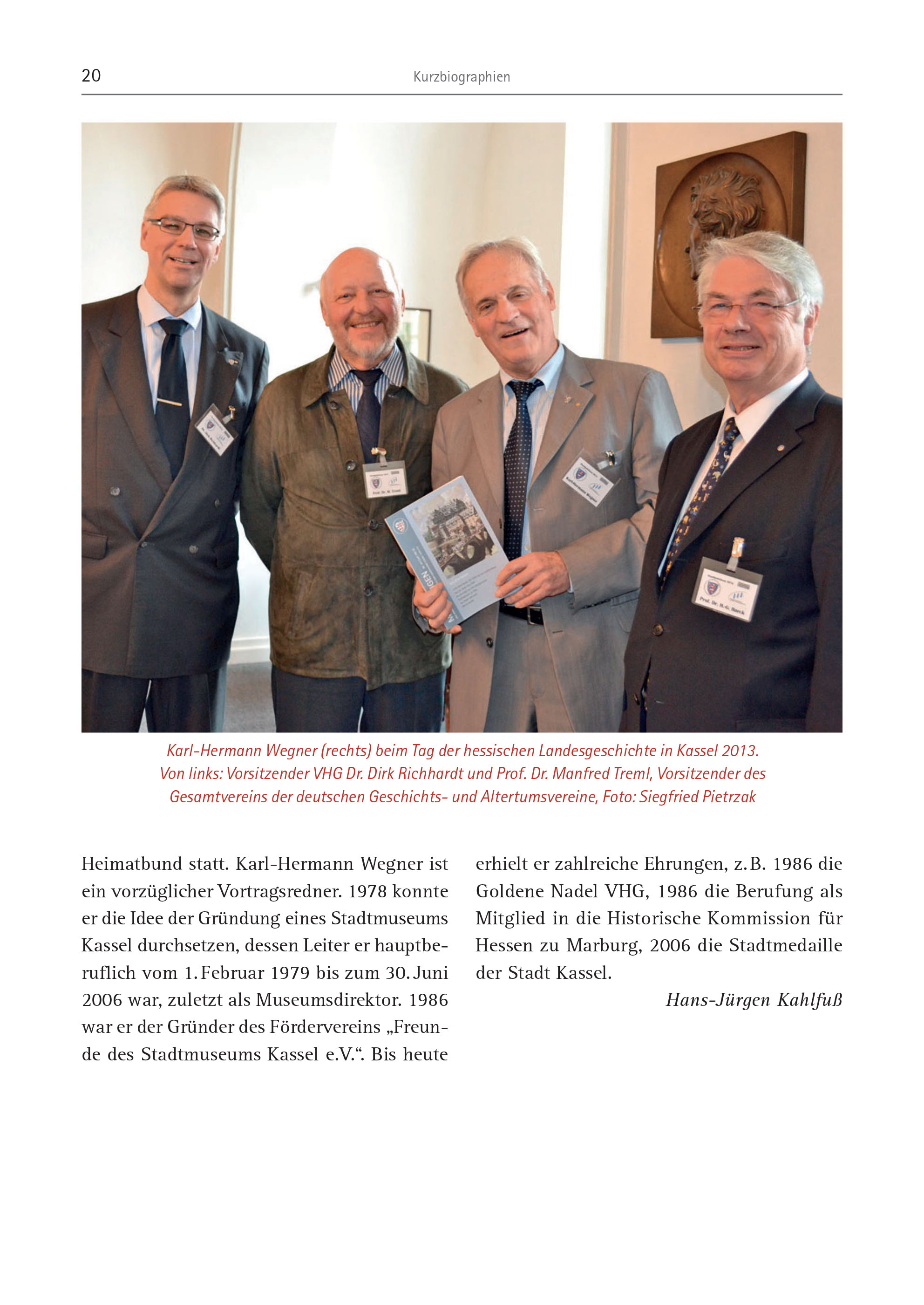 20 Kurzbiographien Heimatbund statt. Karl-Hermann Wegner ist ein vorzüglicher Vortragsredner. 1978 konnte er die Idee der Gründung eines Stadtmuseums Kassel durchsetzen, dessen Leiter er hauptberuflich vom 1. Februar 1979 bis zum 30. Juni 2006 war, zuletzt als Museumsdirektor. 1986 war er der Gründer des Fördervereins „Freunde des Stadtmuseums Kassel e.V.“. Bis heute erhielt er zahlreiche Ehrungen, z. B. 1986 die Goldene Nadel VHG, 1986 die Berufung als Mitglied in die Historische Kommission für Hessen zu Marburg, 2006 die Stadtmedaille der Stadt Kassel. Hans-Jürgen Kahlfuß Karl-Hermann Wegner (rechts) beim Tag der hessischen Landesgeschichte in Kassel 2013. Von links: Vorsitzender VHG Dr. Dirk Richhardt und Prof. Dr. Manfred Treml, Vorsitzender des Gesamtvereins der deutschen Geschichts- und Altertumsvereine, Foto: Siegfried Pietrzak