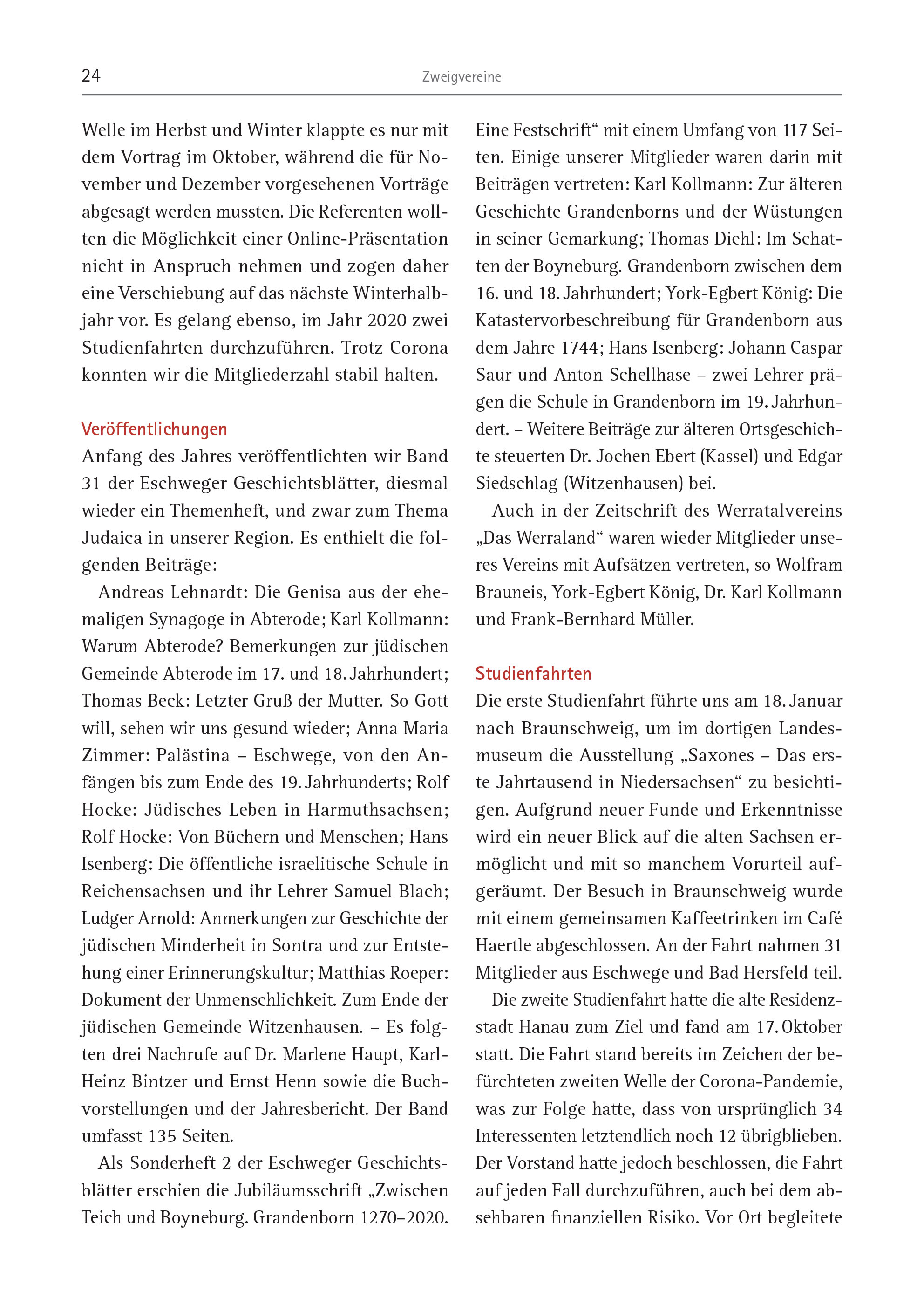 24 Zweigvereine Welle im Herbst und Winter klappte es nur mit dem Vortrag im Oktober, während die für November und Dezember vorgesehenen Vorträge abgesagt werden mussten. Die Referenten wollten die Möglichkeit einer Online-Präsentation nicht in Anspruch nehmen und zogen daher eine Verschiebung auf das nächste Winterhalbjahr vor. Es gelang ebenso, im Jahr 2020 zwei Studienfahrten durchzuführen. Trotz Corona konnten wir die Mitgliederzahl stabil halten. Veröffentlichungen Anfang des Jahres veröffentlichten wir Band 31 der Eschweger Geschichtsblätter, diesmal wieder ein Themenheft, und zwar zum Thema Judaica in unserer Region. Es enthielt die folgenden Beiträge: Andreas Lehnardt: Die Genisa aus der ehemaligen Synagoge in Abterode; Karl Kollmann: Warum Abterode? Bemerkungen zur jüdischen Gemeinde Abterode im 17. und 18. Jahrhundert; Thomas Beck: Letzter Gruß der Mutter. So Gott will, sehen wir uns gesund wieder; Anna Maria Zimmer: Palästina – Eschwege, von den Anfängen bis zum Ende des 19. Jahrhunderts; Rolf Hocke: Jüdisches Leben in Harmuthsachsen; Rolf Hocke: Von Büchern und Menschen; Hans Isenberg: Die öffentliche israelitische Schule in Reichensachsen und ihr Lehrer Samuel Blach; Ludger Arnold: Anmerkungen zur Geschichte der jüdischen Minderheit in Sontra und zur Entstehung einer Erinnerungskultur; Matthias Roeper: Dokument der Unmenschlichkeit. Zum Ende der jüdischen Gemeinde Witzenhausen. – Es folgten drei Nachrufe auf Dr. Marlene Haupt, Karl- Heinz Bintzer und Ernst Henn sowie die Buchvorstellungen und der Jahresbericht. Der Band umfasst 135 Seiten. Als Sonderheft 2 der Eschweger Geschichtsblätter erschien die Jubiläumsschrift „Zwischen Teich und Boyneburg. Grandenborn 1270–2020. Eine Festschrift“ mit einem Umfang von 117 Seiten. Einige unserer Mitglieder waren darin mit Beiträgen vertreten: Karl Kollmann: Zur älteren Geschichte Grandenborns und der Wüstungen in seiner Gemarkung; Thomas Diehl: Im Schatten der Boyneburg. Grandenborn zwischen dem 16. und 18. Jahrhundert; York-Egbert König: Die Katastervorbeschreibung für Grandenborn aus dem Jahre 1744; Hans Isenberg: Johann Caspar Saur und Anton Schellhase – zwei Lehrer prägen die Schule in Grandenborn im 19. Jahrhundert. – Weitere Beiträge zur älteren Ortsgeschichte steuerten Dr. Jochen Ebert (Kassel) und Edgar Siedschlag (Witzenhausen) bei. Auch in der Zeitschrift des Werratalvereins „Das Werraland“ waren wieder Mitglieder unseres Vereins mit Aufsätzen vertreten, so Wolfram Brauneis, York-Egbert König, Dr. Karl Kollmann und Frank-Bernhard Müller. Studienfahrten Die erste Studienfahrt führte uns am 18. Januar nach Braunschweig, um im dortigen Landesmuseum die Ausstellung „Saxones – Das erste Jahrtausend in Niedersachsen“ zu besichtigen. Aufgrund neuer Funde und Erkenntnisse wird ein neuer Blick auf die alten Sachsen ermöglicht und mit so manchem Vorurteil aufgeräumt. Der Besuch in Braunschweig wurde mit einem gemeinsamen Kaffeetrinken im Café Haertle abgeschlossen. An der Fahrt nahmen 31 Mitglieder aus Eschwege und Bad Hersfeld teil. Die zweite Studienfahrt hatte die alte Residenzstadt Hanau zum Ziel und fand am 17. Oktober statt. Die Fahrt stand bereits im Zeichen der befürchteten zweiten Welle der Corona-Pandemie, was zur Folge hatte, dass von ursprünglich 34 Interessenten letztendlich noch 12 übrigblieben. Der Vorstand hatte jedoch beschlossen, die Fahrt auf jeden Fall durchzuführen, auch bei dem absehbaren finanziellen Risiko. Vor Ort begleitete