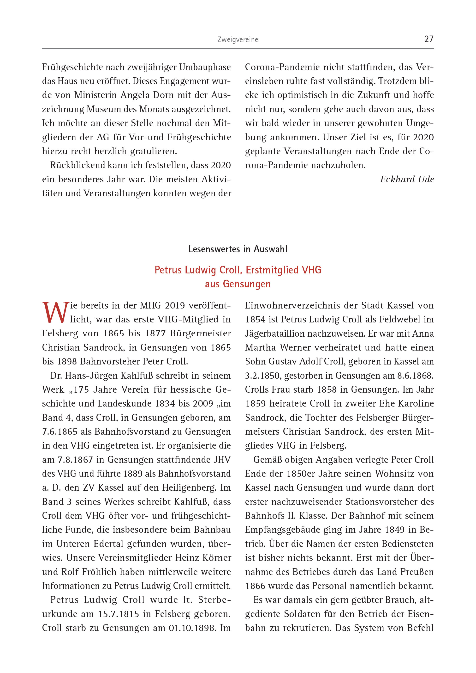 Zweigvereine 27 Frühgeschichte nach zweijähriger Umbauphase das Haus neu eröffnet. Dieses Engagement wurde von Ministerin Angela Dorn mit der Auszeichnung Museum des Monats ausgezeichnet. Ich möchte an dieser Stelle nochmal den Mitgliedern der AG für Vor-und Frühgeschichte hierzu recht herzlich gratulieren. Rückblickend kann ich feststellen, dass 2020 ein besonderes Jahr war. Die meisten Aktivitäten und Veranstaltungen konnten wegen der Corona-Pandemie nicht stattfinden, das Vereinsleben ruhte fast vollständig. Trotzdem blicke ich optimistisch in die Zukunft und hoffe nicht nur, sondern gehe auch davon aus, dass wir bald wieder in unserer gewohnten Umgebung ankommen. Unser Ziel ist es, für 2020 geplante Veranstaltungen nach Ende der Corona- Pandemie nachzuholen. Eckhard Ude Wie bereits in der MHG 2019 veröffentlicht, war das erste VHG-Mitglied in Felsberg von 1865 bis 1877 Bürgermeister Christian Sandrock, in Gensungen von 1865 bis 1898 Bahnvorsteher Peter Croll. Dr. Hans-Jürgen Kahlfuß schreibt in seinem Werk „175 Jahre Verein für hessische Geschichte und Landeskunde 1834 bis 2009 „im Band 4, dass Croll, in Gensungen geboren, am 7.6.1865 als Bahnhofsvorstand zu Gensungen in den VHG eingetreten ist. Er organisierte die am 7.8.1867 in Gensungen stattfindende JHV des VHG und führte 1889 als Bahnhofsvorstand a. D. den ZV Kassel auf den Heiligenberg. Im Band 3 seines Werkes schreibt Kahlfuß, dass Croll dem VHG öfter vor- und frühgeschichtliche Funde, die insbesondere beim Bahnbau im Unteren Edertal gefunden wurden, überwies. Unsere Vereinsmitglieder Heinz Körner und Rolf Fröhlich haben mittlerweile weitere Informationen zu Petrus Ludwig Croll ermittelt. Petrus Ludwig Croll wurde lt. Sterbeurkunde am 15.7.1815 in Felsberg geboren. Croll starb zu Gensungen am 01.10.1898. Im Einwohnerverzeichnis der Stadt Kassel von 1854 ist Petrus Ludwig Croll als Feldwebel im Jägerbataillion nachzuweisen. Er war mit Anna Martha Werner verheiratet und hatte einen Sohn Gustav Adolf Croll, geboren in Kassel am 3.2.1850, gestorben in Gensungen am 8.6.1868. Crolls Frau starb 1858 in Gensungen. Im Jahr 1859 heiratete Croll in zweiter Ehe Karoline Sandrock, die Tochter des Felsberger Bürgermeisters Christian Sandrock, des ersten Mitgliedes VHG in Felsberg. Gemäß obigen Angaben verlegte Peter Croll Ende der 1850er Jahre seinen Wohnsitz von Kassel nach Gensungen und wurde dann dort erster nachzuweisender Stationsvorsteher des Bahnhofs II. Klasse. Der Bahnhof mit seinem Empfangsgebäude ging im Jahre 1849 in Betrieb. Über die Namen der ersten Bediensteten ist bisher nichts bekannt. Erst mit der Übernahme des Betriebes durch das Land Preußen 1866 wurde das Personal namentlich bekannt. Es war damals ein gern geübter Brauch, altgediente Soldaten für den Betrieb der Eisenbahn zu rekrutieren. Das System von Befehl Lesenswertes in Auswahl Petrus Ludwig Croll, Erstmitglied VHG aus Gensungen