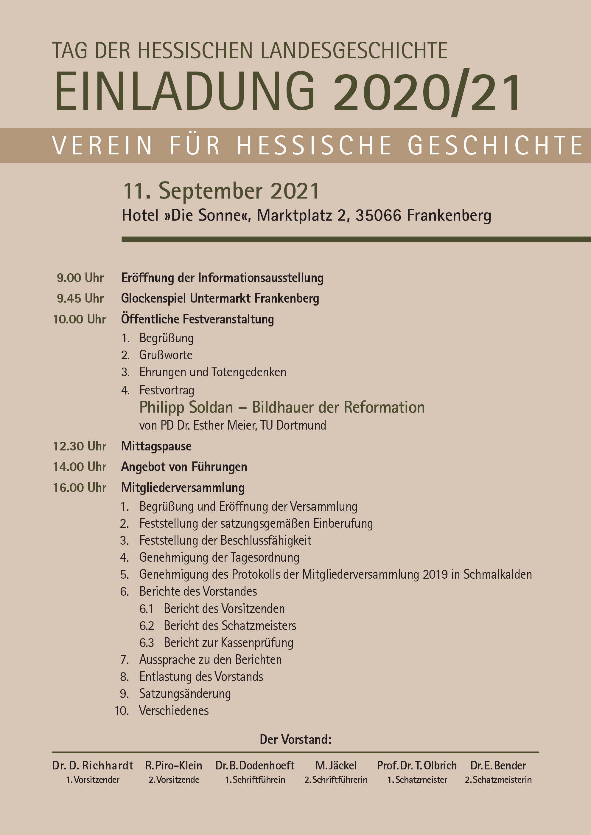 36 Zweigvereine V E R E I N F Ü R H E S S I S C H E G E S C H I C H T E UND 11. September 2021 Hotel »Die Sonne«, Marktplatz 2, 35066 Frankenberg V E R E I N F Ü R H E S S I S C H E G E S C H I C H T E U N 2 TAG DER HESSISCHEN LANDESGESCHICHTE EINLADUNG 2020/21 9.00 Uhr Eröffnung der Informationsausstellung 9.45 Uhr Glockenspiel Untermarkt Frankenberg 10.00 Uhr Öffentliche Festveranstaltung 1. Begrüßung 2. Grußworte 3. Ehrungen und Totengedenken 4. Festvortrag Philipp Soldan – Bildhauer der Reformation von PD Dr. Esther Meier, TU Dortmund 12.30 Uhr Mittagspause 14.00 Uhr Angebot von Führungen 16.00 Uhr Mitgliederversammlung 1. Begrüßung und Eröffnung der Versammlung 2. Feststellung der satzungsgemäßen Einberufung 3. Feststellung der Beschlussfähigkeit 4. Genehmigung der Tagesordnung 5. Genehmigung des Protokolls der Mitgliederversammlung 2019 in Schmalkalden 6. Berichte des Vorstandes 6.1 Bericht des Vorsitzenden 6.2 Bericht des Schatzmeisters 6.3 Bericht zur Kassenprüfung 7. Aussprache zu den Berichten 8. Entlastung des Vorstands 9. Satzungsänderung 10. Verschiedenes Dr. D. Richhardt 1. Vorsitzender R. Piro-Klein 2. Vorsitzende Dr. B. Dodenhoeft 1. Schriftführein M. Jäckel 2. Schriftführerin Prof. Dr. T. Olbrich 1. Schatzmeister Dr. E. Bender 2. Schatzmeisterin Der Vorstand: