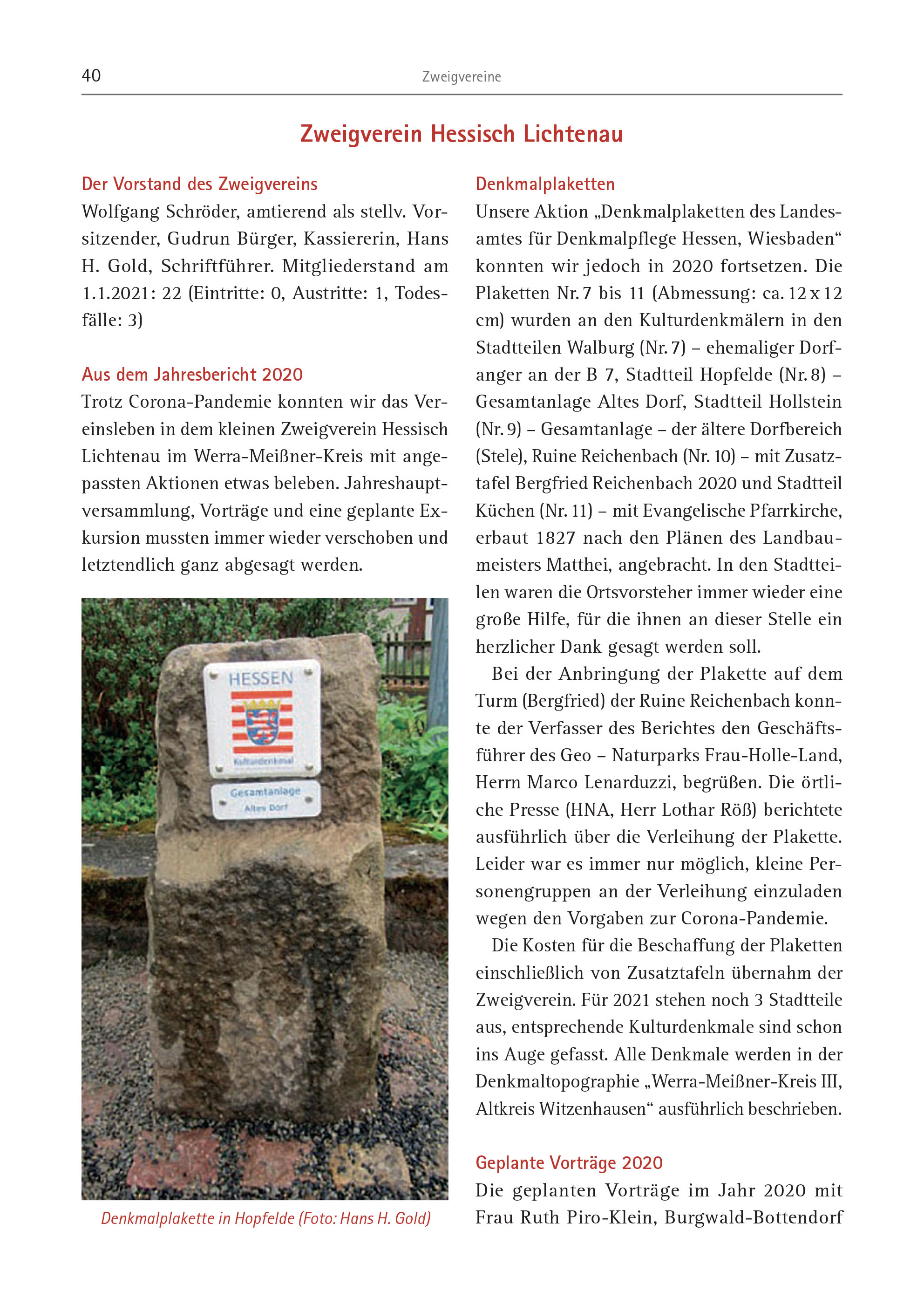 40 Zweigvereine Der Vorstand des Zweigvereins Wolfgang Schröder, amtierend als stellv. Vorsitzender, Gudrun Bürger, Kassiererin, Hans H. Gold, Schriftführer. Mitgliederstand am 1.1.2021: 22 (Eintritte: 0, Austritte: 1, Todesfälle: 3) Aus dem Jahresbericht 2020 Trotz Corona-Pandemie konnten wir das Vereinsleben in dem kleinen Zweigverein Hessisch Lichtenau im Werra-Meißner-Kreis mit angepassten Aktionen etwas beleben. Jahreshauptversammlung, Vorträge und eine geplante Exkursion mussten immer wieder verschoben und letztendlich ganz abgesagt werden. Denkmalplaketten Unsere Aktion „Denkmalplaketten des Landesamtes für Denkmalpflege Hessen, Wiesbaden“ konnten wir jedoch in 2020 fortsetzen. Die Plaketten Nr. 7 bis 11 (Abmessung: ca. 12 x 12 cm) wurden an den Kulturdenkmälern in den Stadtteilen Walburg (Nr. 7) – ehemaliger Dorfanger an der B 7, Stadtteil Hopfelde (Nr. 8) – Gesamtanlage Altes Dorf, Stadtteil Hollstein (Nr. 9) – Gesamtanlage – der ältere Dorfbereich (Stele), Ruine Reichenbach (Nr. 10) – mit Zusatztafel Bergfried Reichenbach 2020 und Stadtteil Küchen (Nr. 11) – mit Evangelische Pfarrkirche, erbaut 1827 nach den Plänen des Landbaumeisters Matthei, angebracht. In den Stadtteilen waren die Ortsvorsteher immer wieder eine große Hilfe, für die ihnen an dieser Stelle ein herzlicher Dank gesagt werden soll. Bei der Anbringung der Plakette auf dem Turm (Bergfried) der Ruine Reichenbach konnte der Verfasser des Berichtes den Geschäftsführer des Geo – Naturparks Frau-Holle-Land, Herrn Marco Lenarduzzi, begrüßen. Die örtliche Presse (HNA, Herr Lothar Röß) berichtete ausführlich über die Verleihung der Plakette. Leider war es immer nur möglich, kleine Personengruppen an der Verleihung einzuladen wegen den Vorgaben zur Corona-Pandemie. Die Kosten für die Beschaffung der Plaketten einschließlich von Zusatztafeln übernahm der Zweigverein. Für 2021 stehen noch 3 Stadtteile aus, entsprechende Kulturdenkmale sind schon ins Auge gefasst. Alle Denkmale werden in der Denkmaltopographie „Werra-Meißner-Kreis III, Altkreis Witzenhausen“ ausführlich beschrieben. Geplante Vorträge 2020 Die geplanten Vorträge im Jahr 2020 mit Frau Ruth Piro-Klein, Burgwald-Bottendorf Zweigverein Hessisch Lichtenau Denkmalplakette in Hopfelde (Foto: Hans H. Gold)