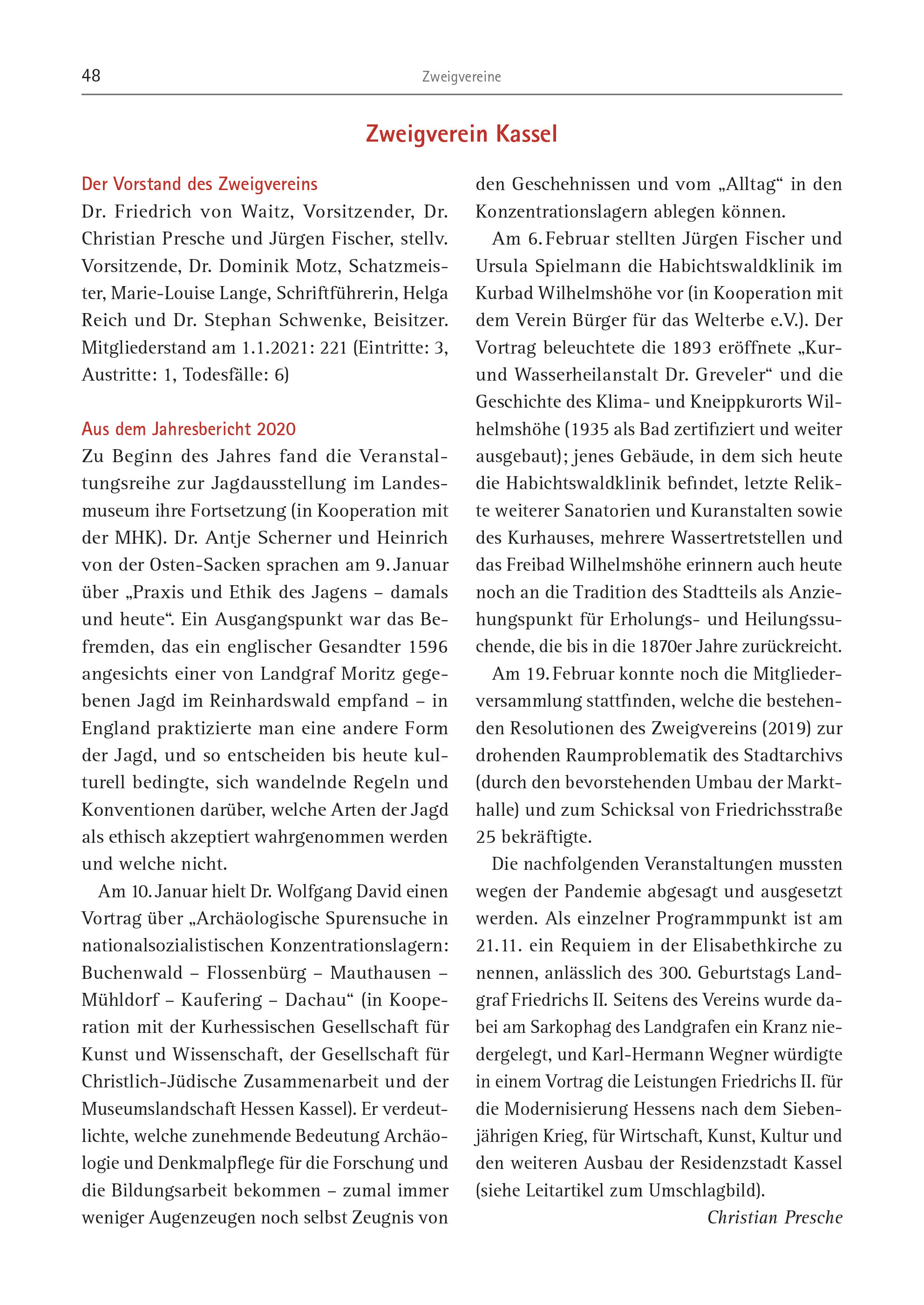 48 Zweigvereine Der Vorstand des Zweigvereins Dr. Friedrich von Waitz, Vorsitzender, Dr. Christian Presche und Jürgen Fischer, stellv. Vorsitzende, Dr. Dominik Motz, Schatzmeister, Marie- Louise Lange, Schriftführerin, Helga Reich und Dr. Stephan Schwenke, Beisitzer. Mitgliederstand am 1.1.2021: 221 (Eintritte: 3, Austritte: 1, Todesfälle: 6) Aus dem Jahresbericht 2020 Zu Beginn des Jahres fand die Veranstaltungsreihe zur Jagdausstellung im Landesmuseum ihre Fortsetzung (in Kooperation mit der MHK). Dr. Antje Scherner und Heinrich von der Osten-Sacken sprachen am 9. Januar über „Praxis und Ethik des Jagens – damals und heute“. Ein Ausgangspunkt war das Befremden, das ein englischer Gesandter 1596 angesichts einer von Landgraf Moritz gegebenen Jagd im Reinhardswald empfand – in England praktizierte man eine andere Form der Jagd, und so entscheiden bis heute kulturell bedingte, sich wandelnde Regeln und Konventionen darüber, welche Arten der Jagd als ethisch akzeptiert wahrgenommen werden und welche nicht. Am 10. Januar hielt Dr. Wolfgang David einen Vortrag über „Archäologische Spurensuche in nationalsozialistischen Konzentrationslagern: Buchenwald – Flossenbürg – Mauthausen – Mühldorf – Kaufering – Dachau“ (in Kooperation mit der Kurhessischen Gesellschaft für Kunst und Wissenschaft, der Gesellschaft für Christlich-Jüdische Zusammenarbeit und der Museumslandschaft Hessen Kassel). Er verdeutlichte, welche zunehmende Bedeutung Archäologie und Denkmalpflege für die Forschung und die Bildungsarbeit bekommen – zumal immer weniger Augenzeugen noch selbst Zeugnis von den Geschehnissen und vom „Alltag“ in den Konzentrationslagern ablegen können. Am 6. Februar stellten Jürgen Fischer und Ursula Spielmann die Habichtswaldklinik im Kurbad Wilhelmshöhe vor (in Kooperation mit dem Verein Bürger für das Welterbe e.V.). Der Vortrag beleuchtete die 1893 eröffnete „Kurund Wasserheilanstalt Dr. Greveler“ und die Geschichte des Klima- und Kneippkurorts Wilhelmshöhe (1935 als Bad zertifiziert und weiter ausgebaut); jenes Gebäude, in dem sich heute die Habichtswaldklinik befindet, letzte Relikte weiterer Sanatorien und Kuranstalten sowie des Kurhauses, mehrere Wassertretstellen und das Freibad Wilhelmshöhe erinnern auch heute noch an die Tradition des Stadtteils als Anziehungspunkt für Erholungs- und Heilungssuchende, die bis in die 1870er Jahre zurückreicht. Am 19. Februar konnte noch die Mitgliederversammlung stattfinden, welche die bestehenden Resolutionen des Zweigvereins (2019) zur drohenden Raumproblematik des Stadtarchivs (durch den bevorstehenden Umbau der Markthalle) und zum Schicksal von Friedrichsstraße 25 bekräftigte. Die nachfolgenden Veranstaltungen mussten wegen der Pandemie abgesagt und ausgesetzt werden. Als einzelner Programmpunkt ist am 21.11. ein Requiem in der Elisabethkirche zu nennen, anlässlich des 300. Geburtstags Landgraf Friedrichs II. Seitens des Vereins wurde dabei am Sarkophag des Landgrafen ein Kranz niedergelegt, und Karl-Hermann Wegner würdigte in einem Vortrag die Leistungen Friedrichs II. für die Modernisierung Hessens nach dem Siebenjährigen Krieg, für Wirtschaft, Kunst, Kultur und den weiteren Ausbau der Residenzstadt Kassel (siehe Leitartikel zum Umschlagbild). Christian Presche Zweigverein Kassel