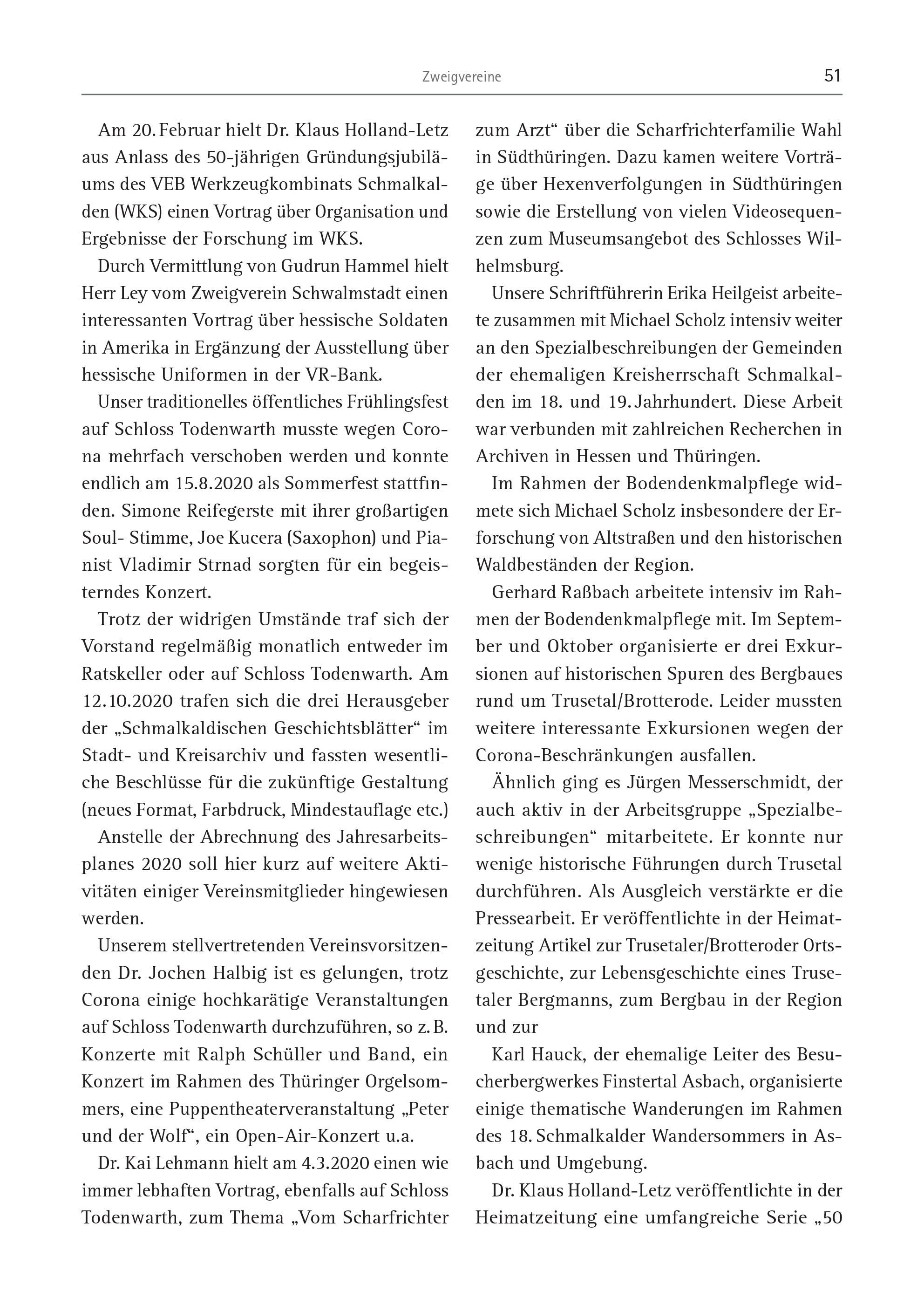 Zweigvereine 51 Am 20. Februar hielt Dr. Klaus Holland-Letz aus Anlass des 50-jährigen Gründungsjubiläums des VEB Werkzeugkombinats Schmalkalden (WKS) einen Vortrag über Organisation und Ergebnisse der Forschung im WKS. Durch Vermittlung von Gudrun Hammel hielt Herr Ley vom Zweigverein Schwalmstadt einen interessanten Vortrag über hessische Soldaten in Amerika in Ergänzung der Ausstellung über hessische Uniformen in der VR-Bank. Unser traditionelles öffentliches Frühlingsfest auf Schloss Todenwarth musste wegen Corona mehrfach verschoben werden und konnte endlich am 15.8.2020 als Sommerfest stattfinden. Simone Reifegerste mit ihrer großartigen Soul- Stimme, Joe Kucera (Saxophon) und Pianist Vladimir Strnad sorgten für ein begeisterndes Konzert. Trotz der widrigen Umstände traf sich der Vorstand regelmäßig monatlich entweder im Ratskeller oder auf Schloss Todenwarth. Am 12.10.2020 trafen sich die drei Herausgeber der „Schmalkaldischen Geschichtsblätter“ im Stadt- und Kreisarchiv und fassten wesentliche Beschlüsse für die zukünftige Gestaltung (neues Format, Farbdruck, Mindestauflage etc.) Anstelle der Abrechnung des Jahresarbeitsplanes 2020 soll hier kurz auf weitere Aktivitäten einiger Vereinsmitglieder hingewiesen werden. Unserem stellvertretenden Vereinsvorsitzenden Dr. Jochen Halbig ist es gelungen, trotz Corona einige hochkarätige Veranstaltungen auf Schloss Todenwarth durchzuführen, so z. B. Konzerte mit Ralph Schüller und Band, ein Konzert im Rahmen des Thüringer Orgelsommers, eine Puppentheaterveranstaltung „Peter und der Wolf“, ein Open-Air-Konzert u.a. Dr. Kai Lehmann hielt am 4.3.2020 einen wie immer lebhaften Vortrag, ebenfalls auf Schloss Todenwarth, zum Thema „Vom Scharfrichter zum Arzt“ über die Scharfrichterfamilie Wahl in Südthüringen. Dazu kamen weitere Vorträge über Hexenverfolgungen in Südthüringen sowie die Erstellung von vielen Videosequenzen zum Museumsangebot des Schlosses Wilhelmsburg. Unsere Schriftführerin Erika Heilgeist arbeitete zusammen mit Michael Scholz intensiv weiter an den Spezialbeschreibungen der Gemeinden der ehemaligen Kreisherrschaft Schmalkalden im 18. und 19. Jahrhundert. Diese Arbeit war verbunden mit zahlreichen Recherchen in Archiven in Hessen und Thüringen. Im Rahmen der Bodendenkmalpflege widmete sich Michael Scholz insbesondere der Erforschung von Altstraßen und den historischen Waldbeständen der Region. Gerhard Raßbach arbeitete intensiv im Rahmen der Bodendenkmalpflege mit. Im September und Oktober organisierte er drei Exkursionen auf historischen Spuren des Bergbaues rund um Trusetal/Brotterode. Leider mussten weitere interessante Exkursionen wegen der Corona-Beschränkungen ausfallen. Ähnlich ging es Jürgen Messerschmidt, der auch aktiv in der Arbeitsgruppe „Spezialbeschreibungen“ mitarbeitete. Er konnte nur wenige historische Führungen durch Trusetal durchführen. Als Ausgleich verstärkte er die Pressearbeit. Er veröffentlichte in der Heimatzeitung Artikel zur Trusetaler/Brotteroder Ortsgeschichte, zur Lebensgeschichte eines Trusetaler Bergmanns, zum Bergbau in der Region und zur Karl Hauck, der ehemalige Leiter des Besucherbergwerkes Finstertal Asbach, organisierte einige thematische Wanderungen im Rahmen des 18. Schmalkalder Wandersommers in Asbach und Umgebung. Dr. Klaus Holland-Letz veröffentlichte in der Heimatzeitung eine umfangreiche Serie „50